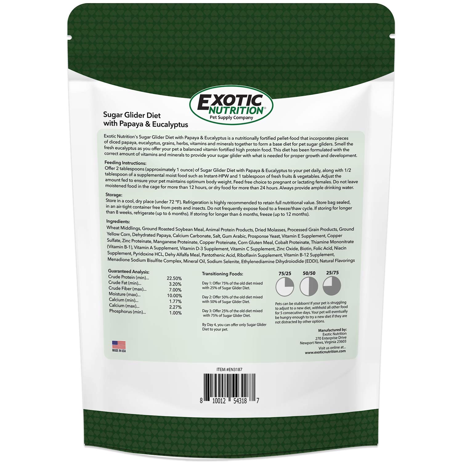 Exotic Nutrition's Sugar Glider Diet with Papaya and Eucalyptus is a nutritionally fortified pellet-food that contains the finest and freshest grains, herbs, oils, fruits, vitamins and minerals. SIZE: 2 lb. FEATURES: ✔ NATIVE FOOD - Feed your pet with the same type of eucalyptus plant and papaya that Gliders feed on naturally in the wild ✔ NUTRITIOUS - This diet is formulated with the correct amount of vitamins and minerals to give your Sugar Glider exactly what is needed for proper growth and development ✔ COMPLETE - Additional vitamins are not necessary if your glider's diet is made up of at least 75% Sugar Glider Diet with Papaya and Eucalyptus ✔ ALL-NATURAL - 100% natural - no added sugars, flavors, or preservatives. ✔ VARIETY - Lends variety to an otherwise monotonous diet ✔ LONG SHELF LIFE - Refrigerates up to 6 months, freezes up to 12 months GUARANTEED ANALYSIS: crude protein (min) 25.2%, crude fat (min) 3.2%, crude fat (max) 3.8%, crude fiber (max) 3.8%, moisture (max) 13.5%, calcium (min) 1.2%, calcium (max) 2.3%, salt (max) 1.4%, phosphorus (min) 1.16%, ash (max) 2.1%, vitamin A (min) 10,000 iu/lb. FEEDING INSTRUCTIONS: Offer approximately 2 tbsp of Sugar Glider Diet with Papaya and Eucalyptus to your pet daily, along with ½ tbsp of a supplement. Adjust the amount to ensure your pet's optimum body weight (free choice for pregnant or lactating females). Additional vitamins are not necessary if your glider's diet is made up of at least 75% Sugar Glider Diet with Papaya and Eucalyptus. Do not leave moist food out for more than 12 hours, change out pellet food every 24 hours. Always provide fresh drinking water to your sugar glider