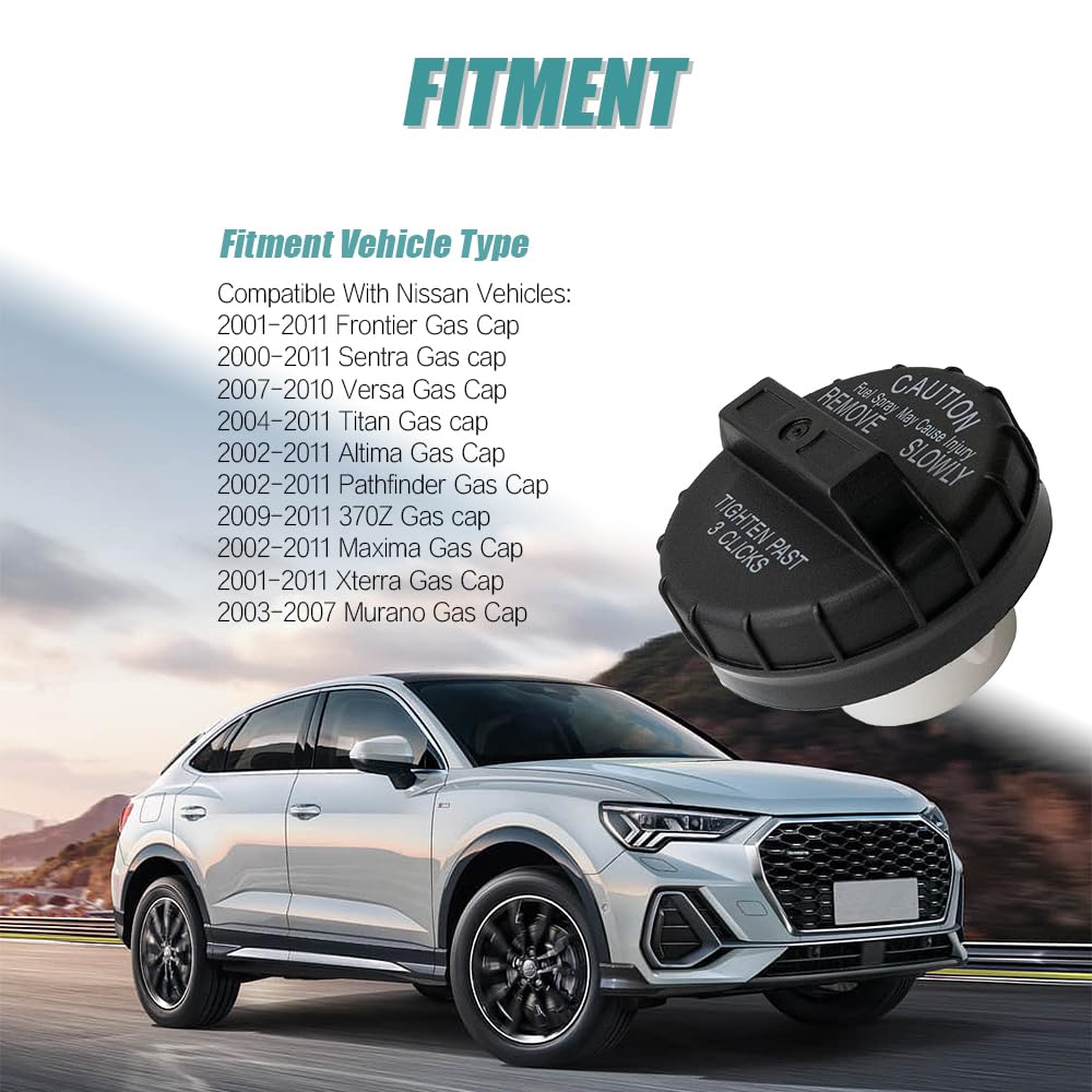 Compatibility: The Gas Cap replacement for Nissan Frontier 2001-2011, for Sentra 2000-2011, for Versa 2007-2010, for Titan 2004-2011, for Altima 2002-2011, for Pathfinder 2002-2011, for 370Z 2009-2011, for Maxima 2002-2011, for Xterra 2001-2011, for Murano 2003-2007, for Murano 2009-2011, for 350Z 2003-2009, for Quest 2000-2002, for Quest 2004-2009, for Cube 2009-2011, for Rogue 2008-2010, for GT-R 2009