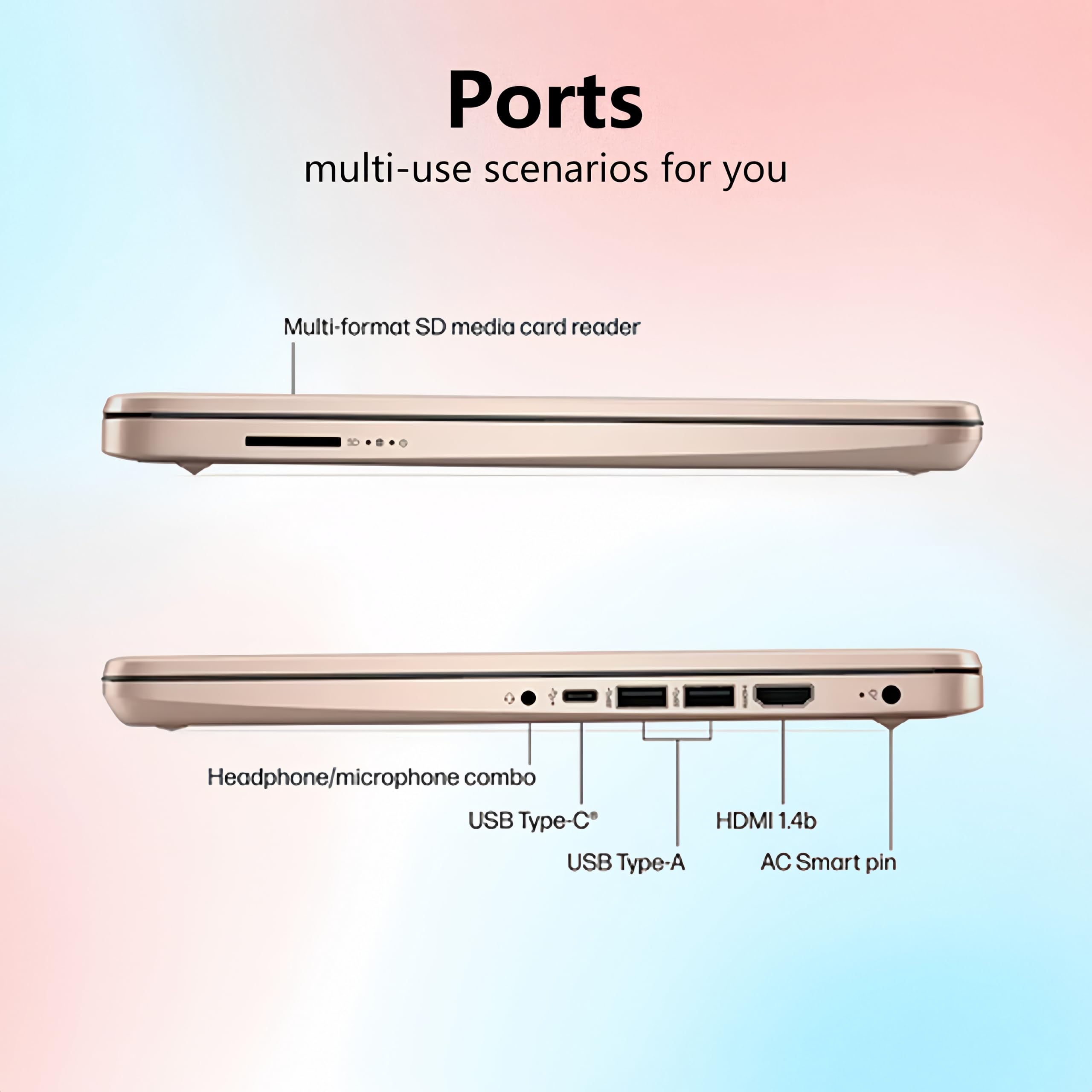 HP 14 LaptopThe most suitable ultra-lightweight and cost-effective laptop for work and study.Graphics: Intel GraphicsOperating system: Windows 11 Software: Free 1-year Microsoft Office 365 SubscriptionMemory: 4GB RAMStorage: 1.12TB Storage (64GB+64GB MSD+1TB Clould)Display: 14-inch diagonal, HD (1366 x 768), micro-edge, anti-glare, 250 nitsConnectivity: Wi-Fi 6 and Bluetooth 5.4 comboAudio: HD Audio with stereo speakersWebcam: HP True Vision 720p HD camera with temporal noise reduction and integrated dual array digital microphonesPorts:1x USB Type-C2x USB Type-A1x Headphone/microphone combo1x AC Smart pin1x HDMI 1.4bBattery: 3-cell, 45 Wh battery, Up to 11.5 hoursDimensions (W x D x H): 12.76 x 8.86 x 0.71 inWeight: 3.24 lbs