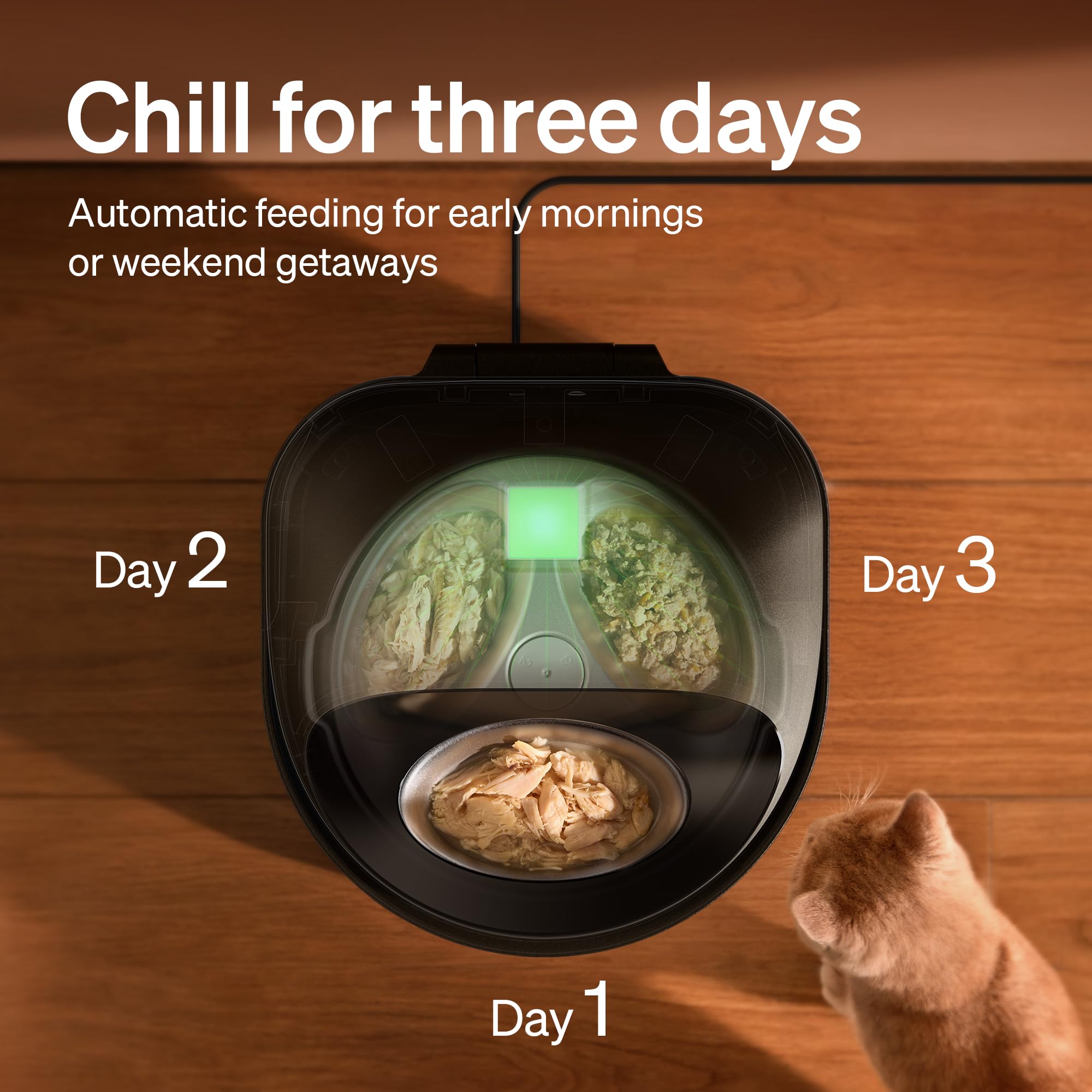 Advanced Cooling Technology: Keep meals fresh for up to 3 days with this automatic cat feeder for wet food. Utilizing semiconductor cooling that is far more efficient than traditional ice packs, it keeps stored food chilled while allowing the serving portion to naturally return to room temperature 30 minutes before eating—ensuring better digestion and taste for your pet.