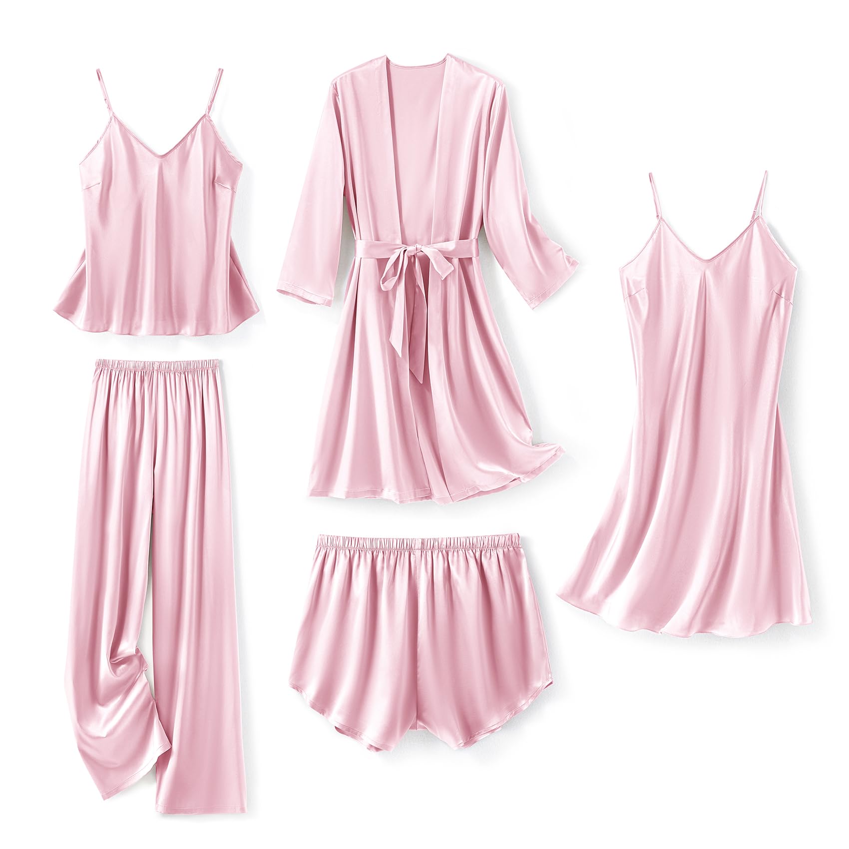 Features--- 5 Piece comfort sleepwear pajama set , include sexy cami dress, cami tops, shorts, long pants and silk robe with belt, with lace makes the sleepwear sexy, with chest pad, detachable. The silk pajamas for women will make you feel silky smooth,luxurious and comfortable,give you best dress experience.