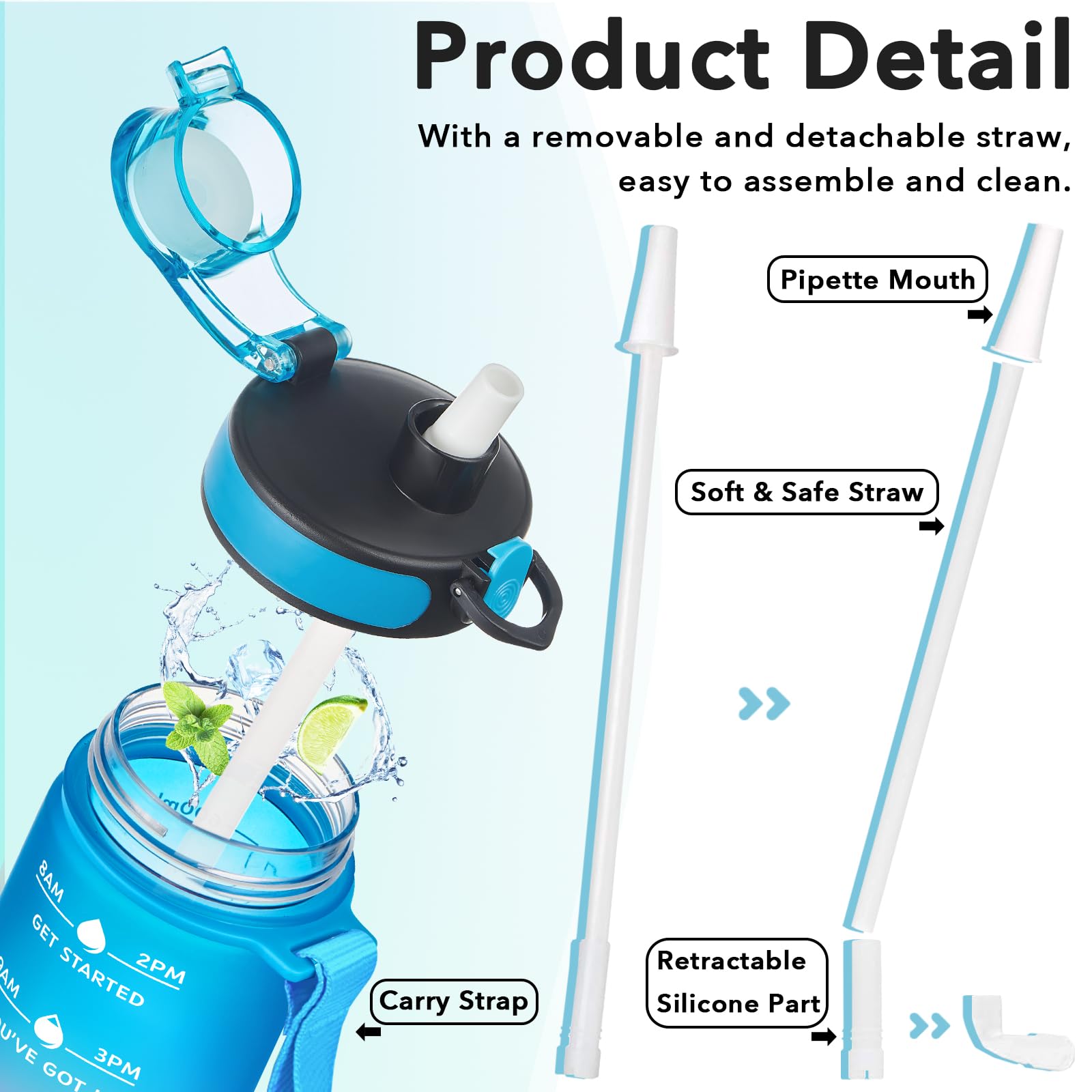 【Two Ways to Drink】Through the upgraded, motivational water bottle has two ways to drink. Equipped with a direct drinking port, drinking water is more enjoyable. One removable straw allows you to enjoy spill-proof sipping.
