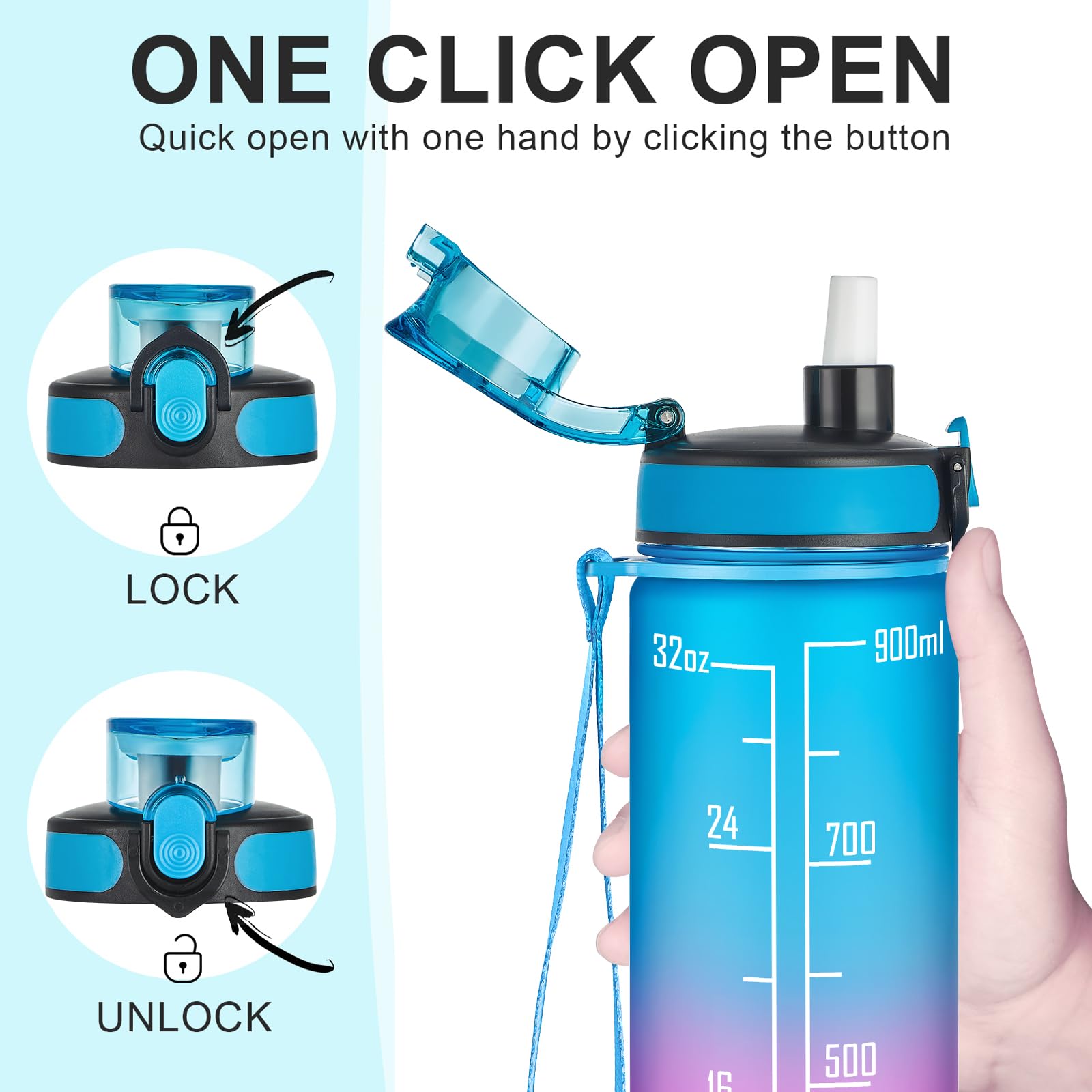 【Humanized Design】Water bottles with times to drink can quick open with one hand. The flip-top lid is used a secure lock, making it dust-free and leak-proof. Time water bottle is portable, light, and easy to use.