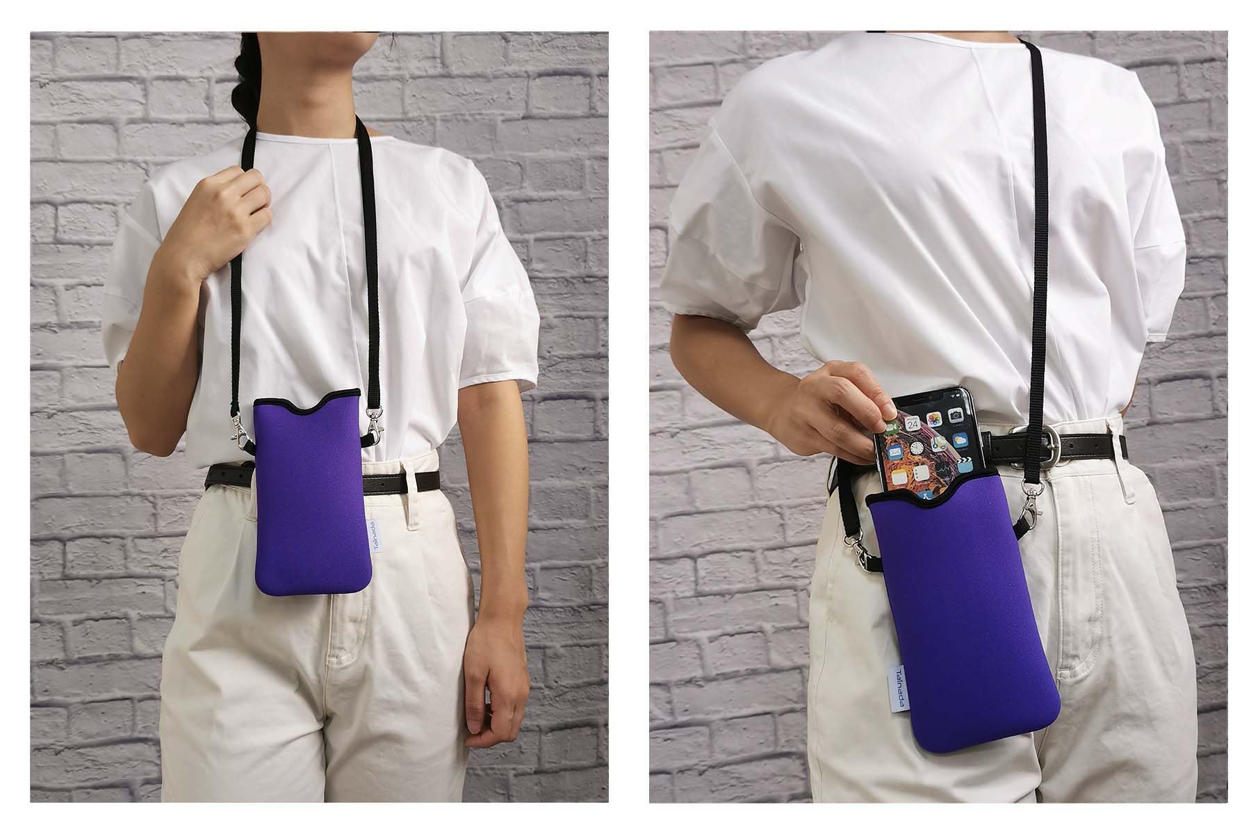 The open-top design makes it easy to slide your phone in and out, and allows you to connect your earphone and charging cable; Lightweight, soft and durable with good hand feeling; the unique hook and loop fasteners inside the pouch help prevent the device stored in the pouch from falling out.