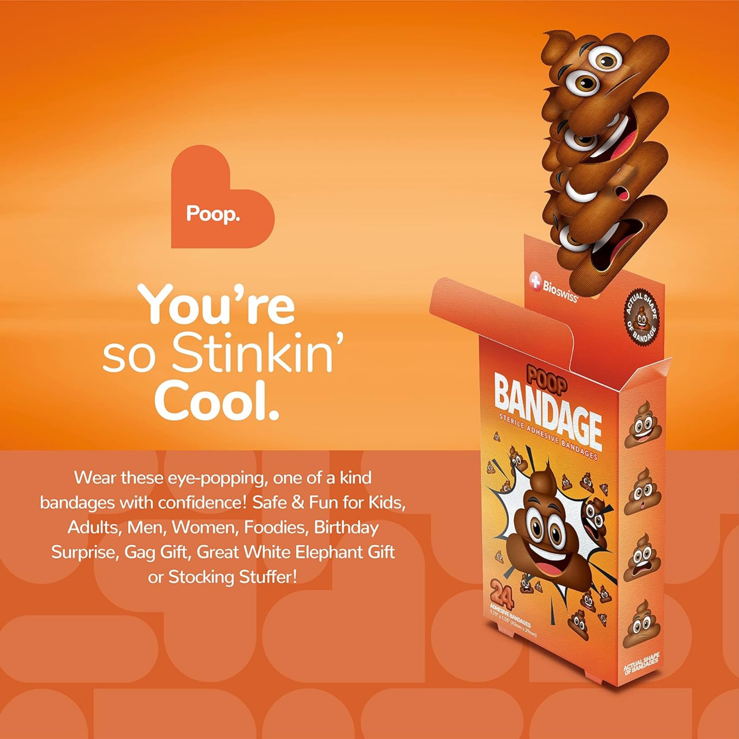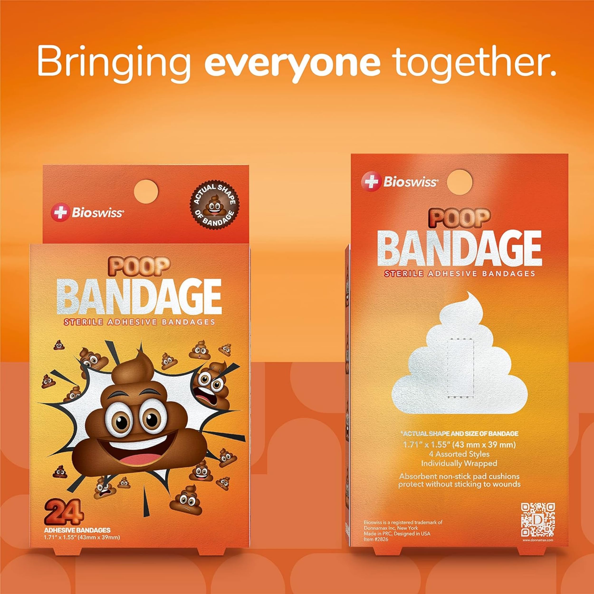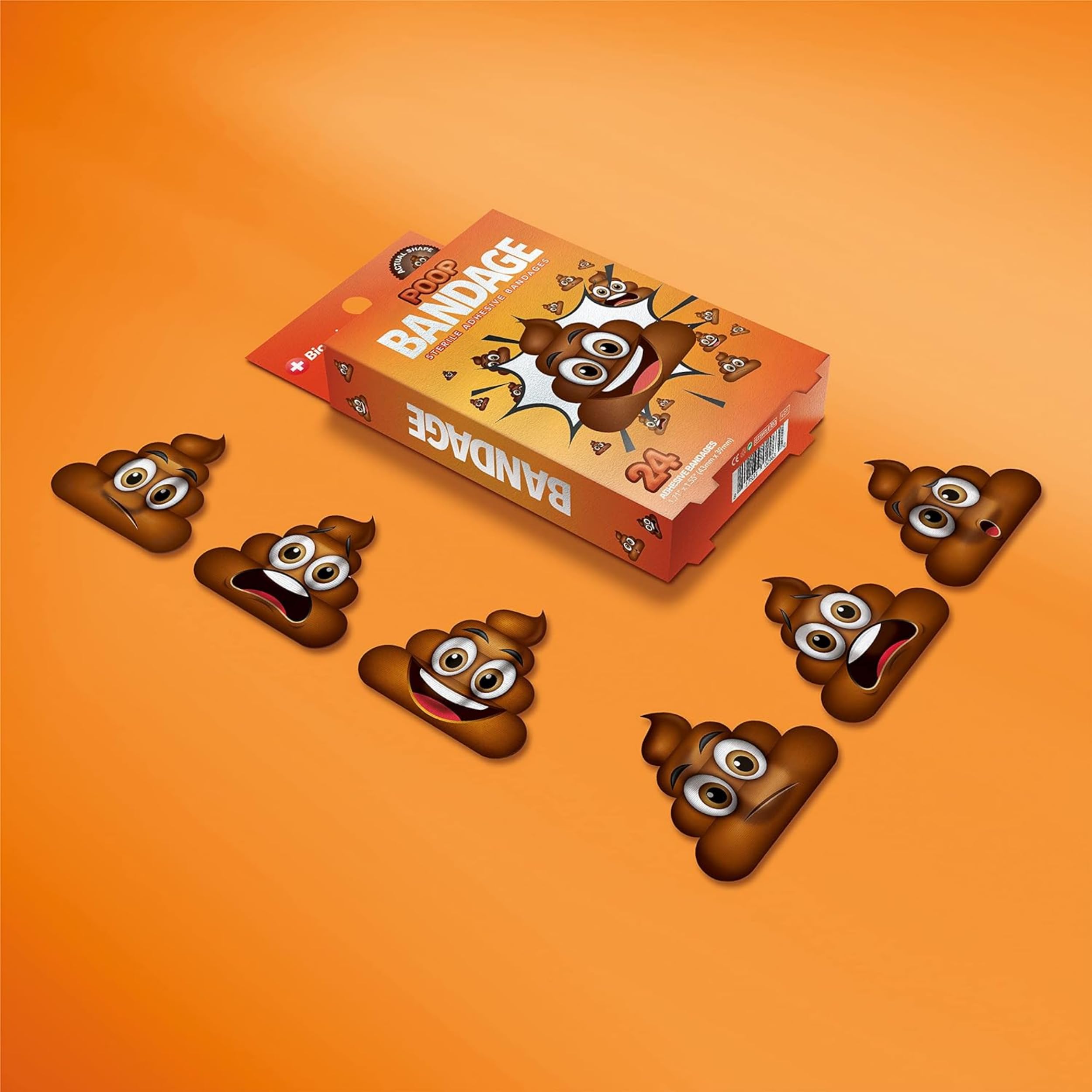 24 POOP BANDAGES: Poop-shaped adhesive bandages pack helps protect cuts, scrapes, and minor wounds while making healing less stressful; bandages come in 4 assorted styles