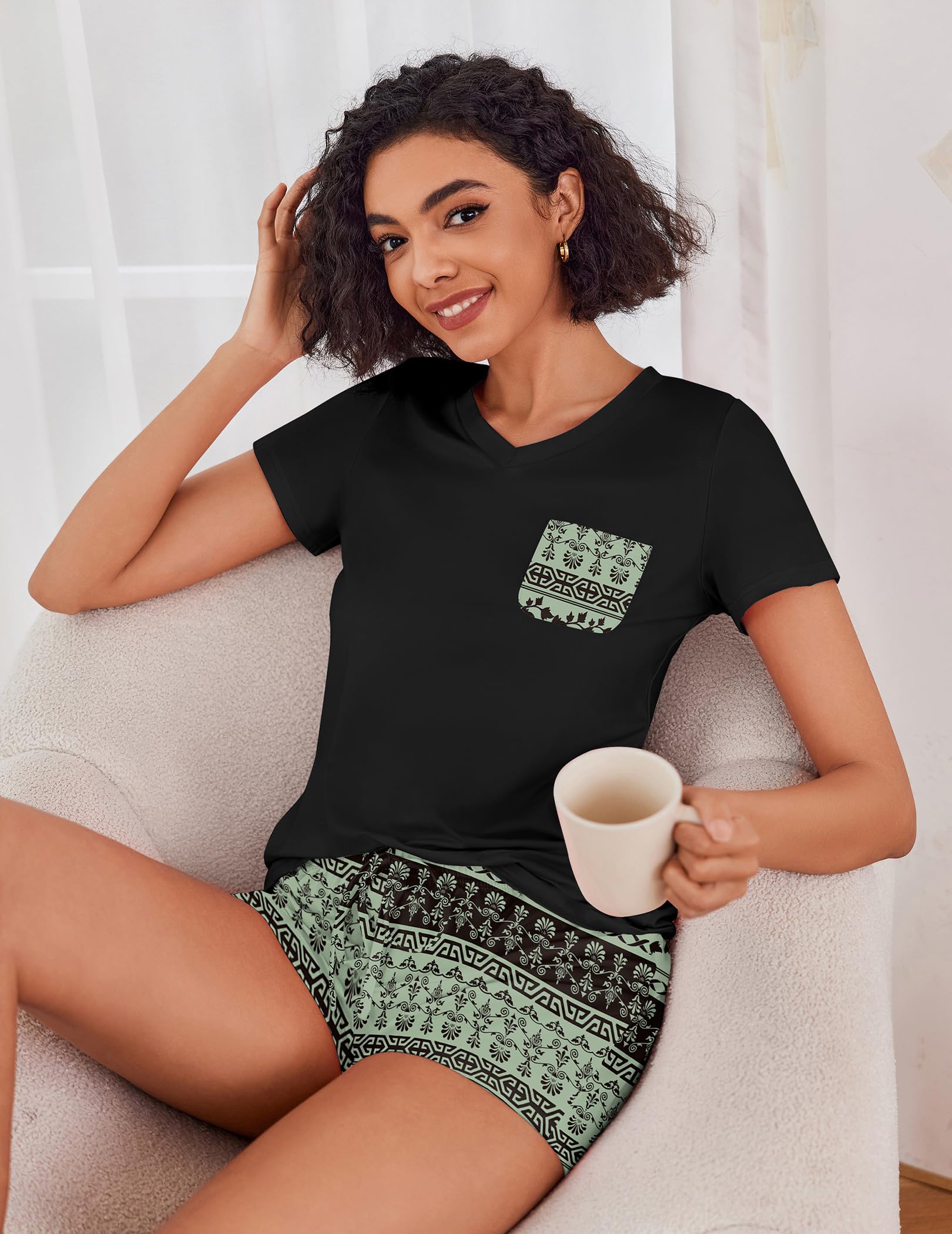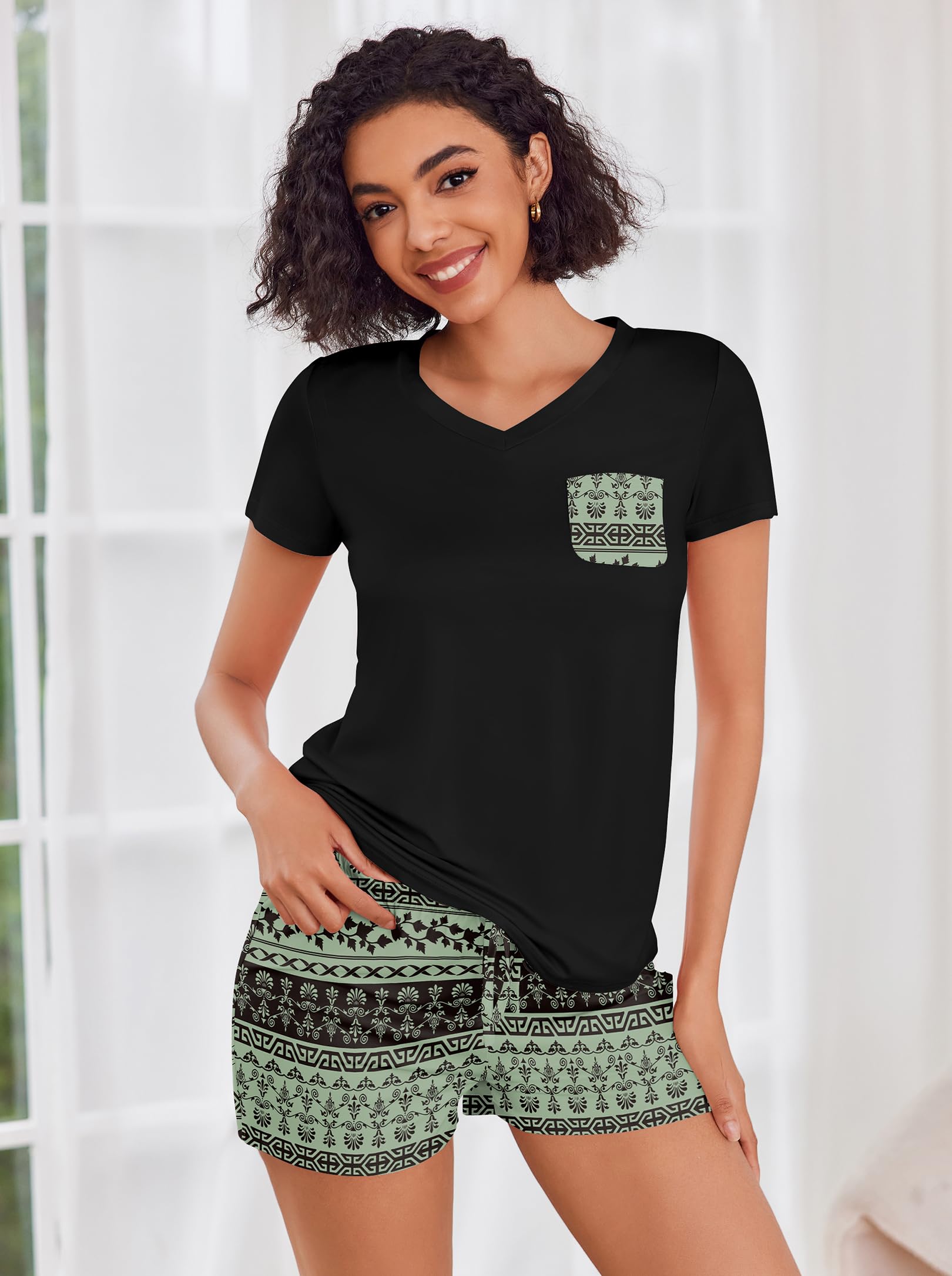 FEATURES: pajama sets for women 2 piece, pj sets for woman, V neck women's pajama sets, short sleeve T-shirt, drawstring elastic waist shorts.