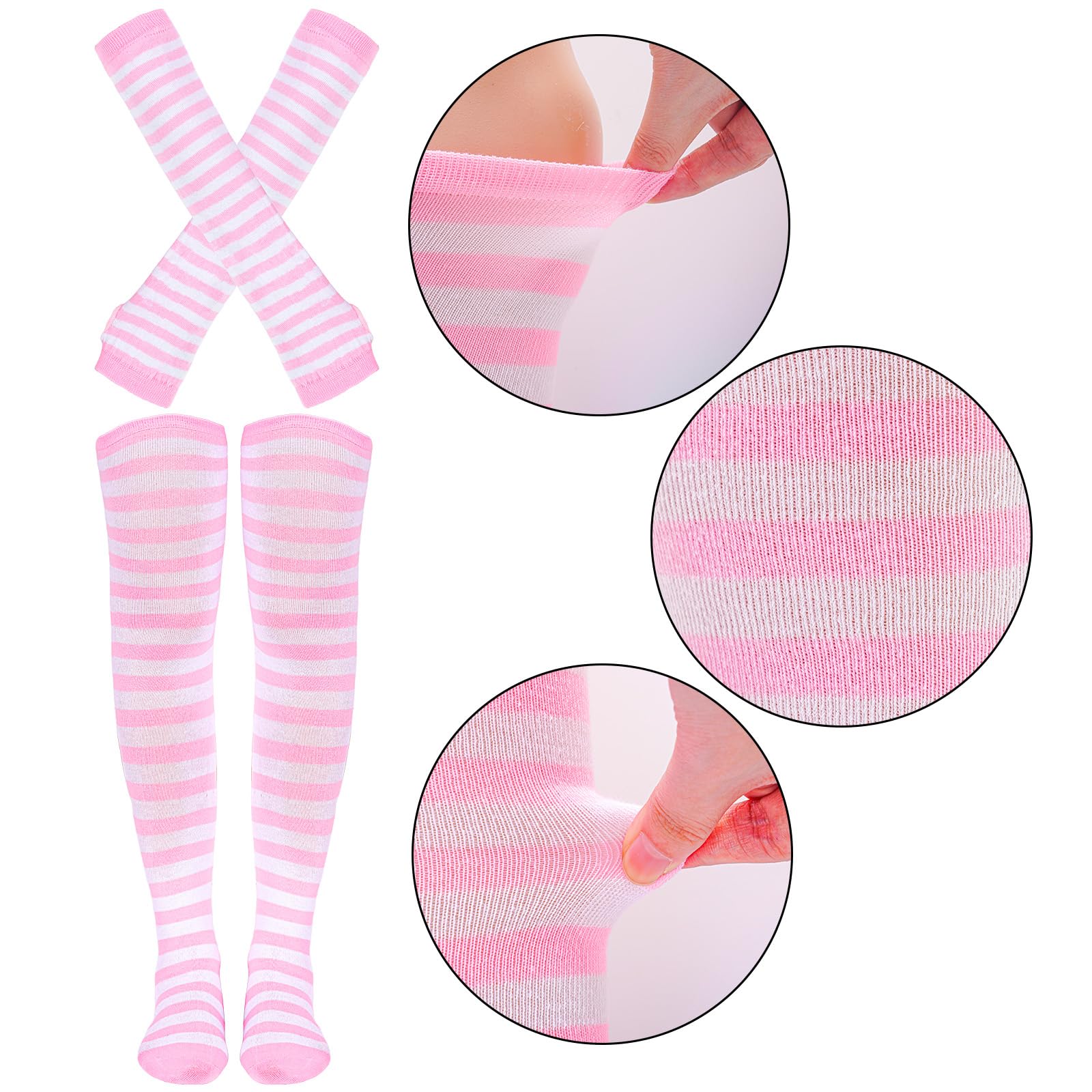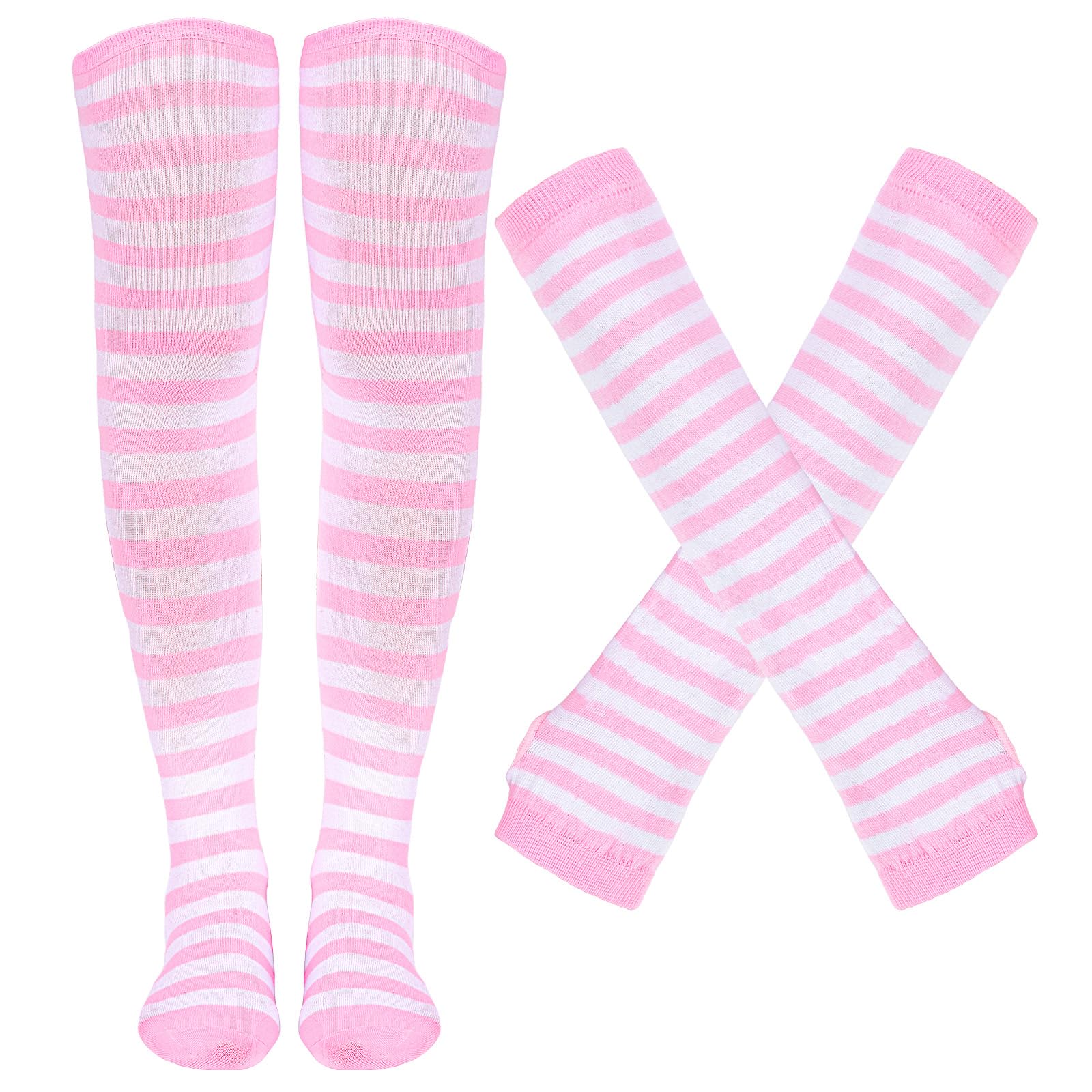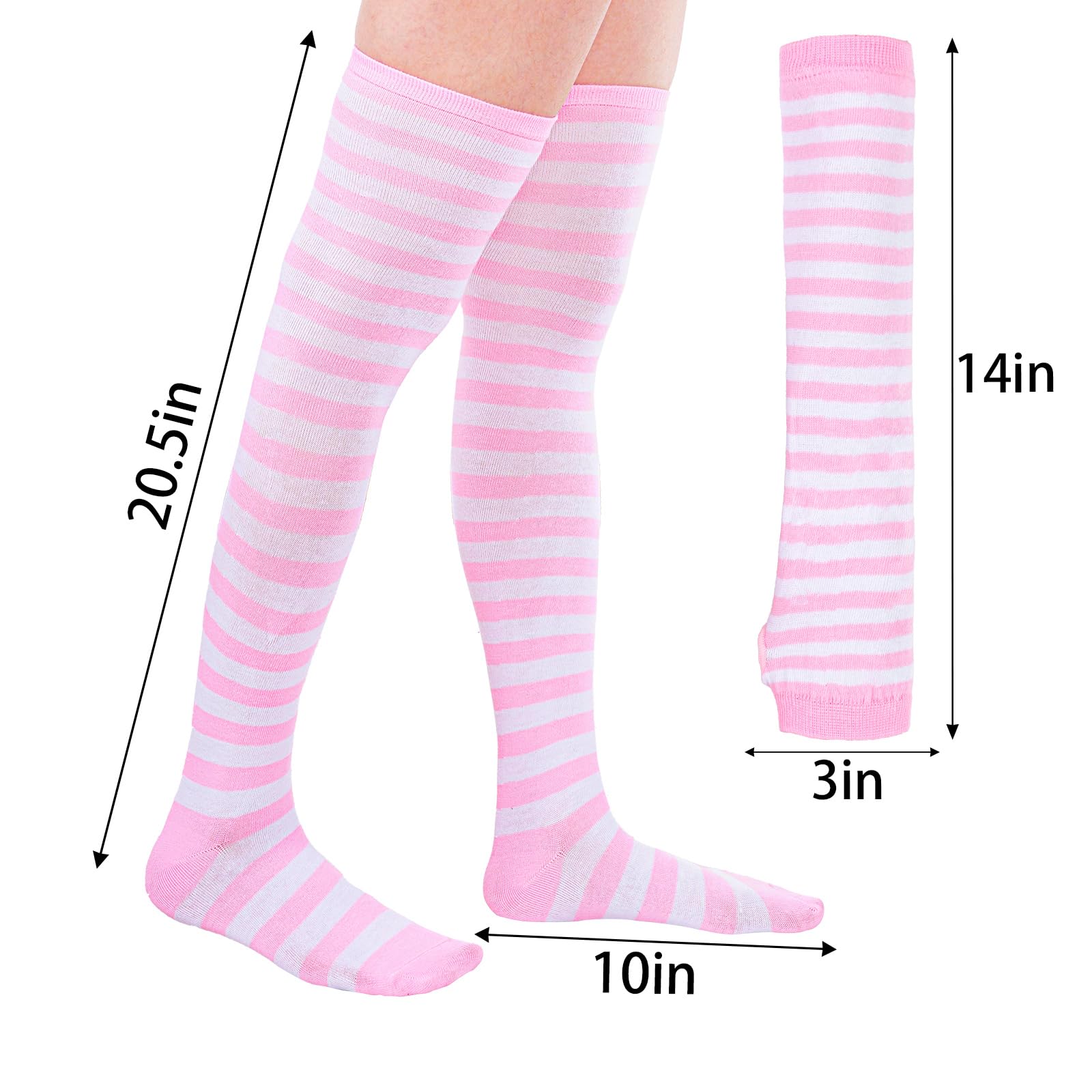 Wide Application Pink and White Striped Socks and Arm Warmer:This glove and sock can be used for a wide range of occasions, whether it is daily or festive wear. Can be used for daily, Halloween dress up, Christmas gifts, holiday cosplay dress up, autumn and winter warm are very suitable. Socks and gloves are a good match, a perfect set, you don't have to buy other accessories to match.