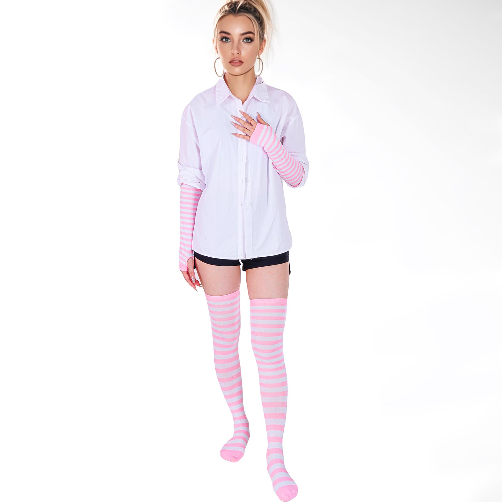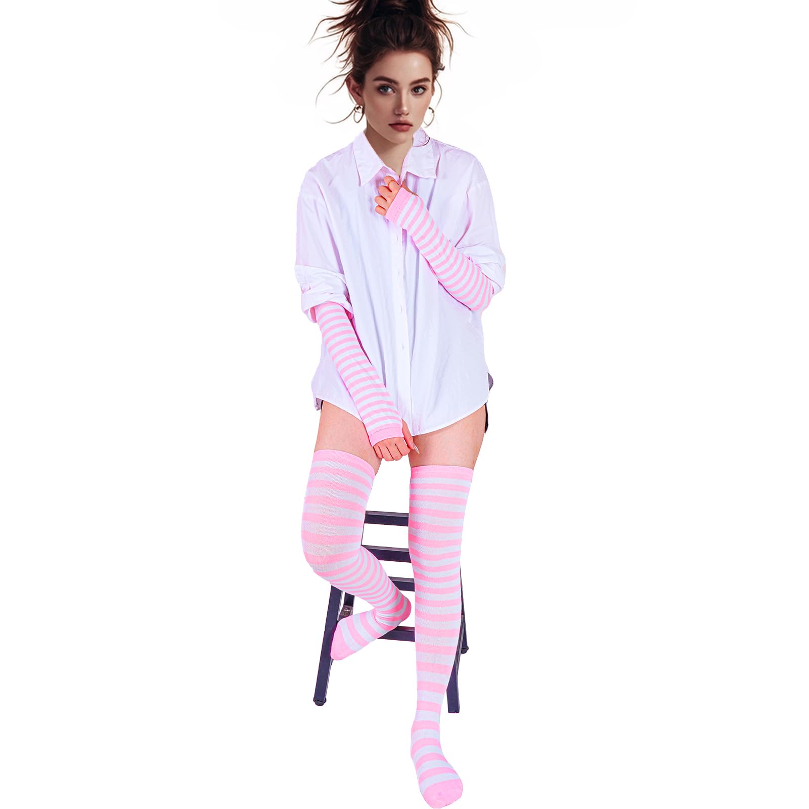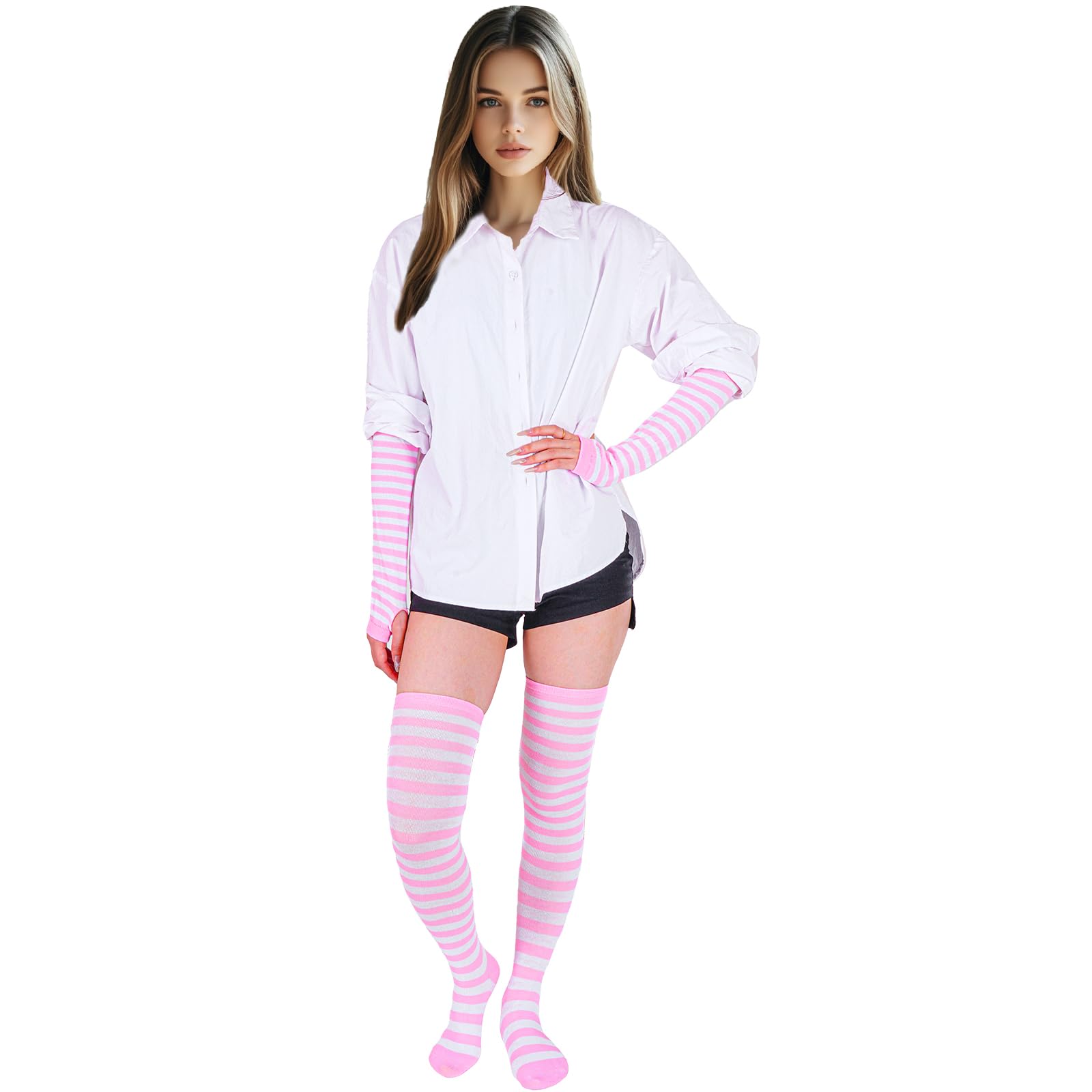 Wide Application Pink and White Striped Socks and Arm Warmer:This glove and sock can be used for a wide range of occasions, whether it is daily or festive wear. Can be used for daily, Halloween dress up, Christmas gifts, holiday cosplay dress up, autumn and winter warm are very suitable. Socks and gloves are a good match, a perfect set, you don't have to buy other accessories to match.