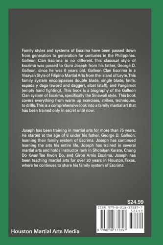 Family styles and systems of Escrima have been passed down from generation to generation for centuries in the Philippines. Galleon Clan Escrima is no different. This classical style of Escrima was passed to Guro Joseph from his father, George D. Galleon, since he weas 6 years old. Galleon Clan Escrima is a Visayan Style of Filipino Martial Arts from the island of Leyte. This family system encompasses double blade, single blade, knife, espada y daga (sword and dagger), sibat (staff), and Pangamot (empty hand fighting). This book is a biography of the Galleon Clan system of Escrima, specifically the Sinawali style. This book covers everything from warm up exercises, strikes, techniques, to drills. This is a comprehensive look into a family martial art that has been trained only in secret until now. This book describes a family system of Escrima. Escrima is a Filipino martial art similar to Arnis and Kali. This martial art is ideal for self defense as it encompasses weapons and empty hand combatives. Within the covers of Galleon Clan Escrima are explanations, examples, and educational training material of the Sinawali or double weapon fighting style of the system.