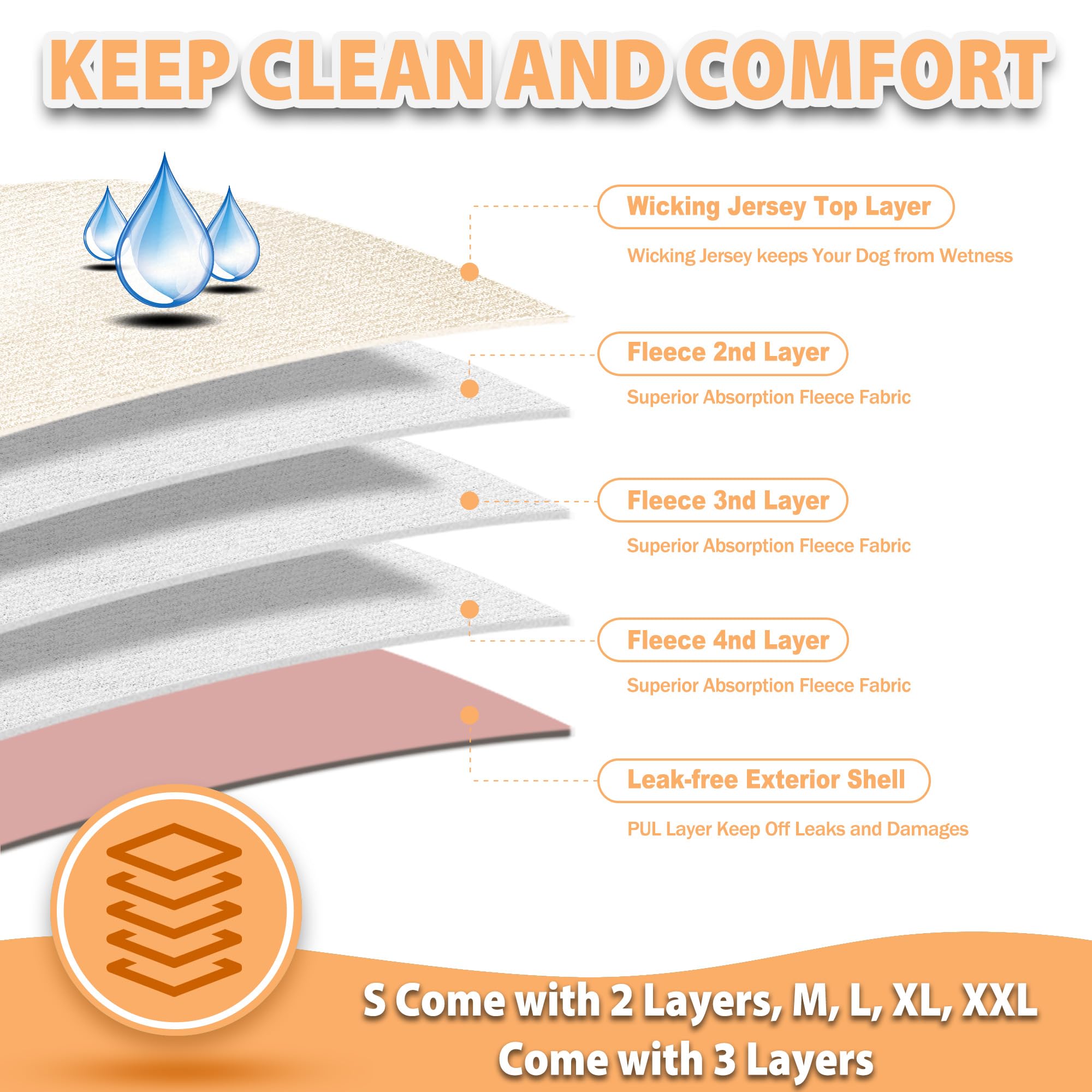 Absorbent & Leak-free Materials - The reusable female dog diaper inner layer is made of soft and breathable beige color wicking jersey, perfect to keep the dog from wetness. The 3 middle layers are made of highly absorbent fleece to absorb the liquid and stop any leaks.The diaper outer layer, with attractive and fun designs, is made of smooth and soft-to-touch leak-free TPU material to keep the floor or bed dry and clean.