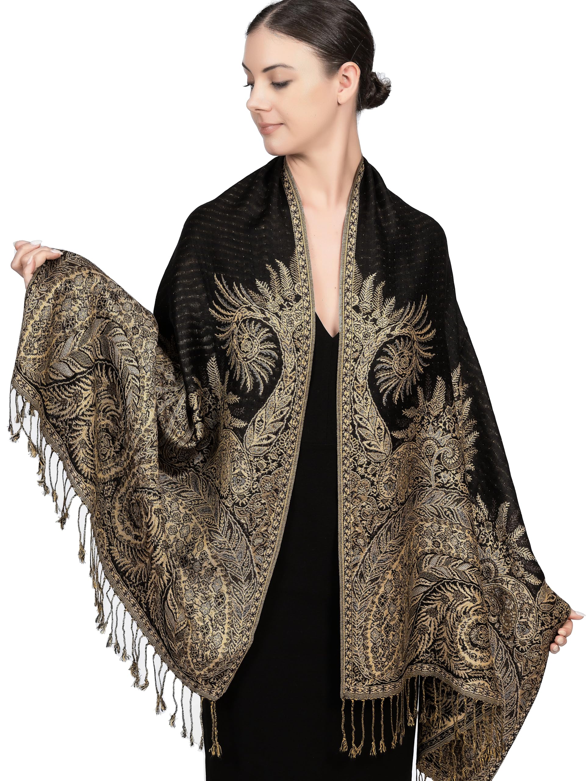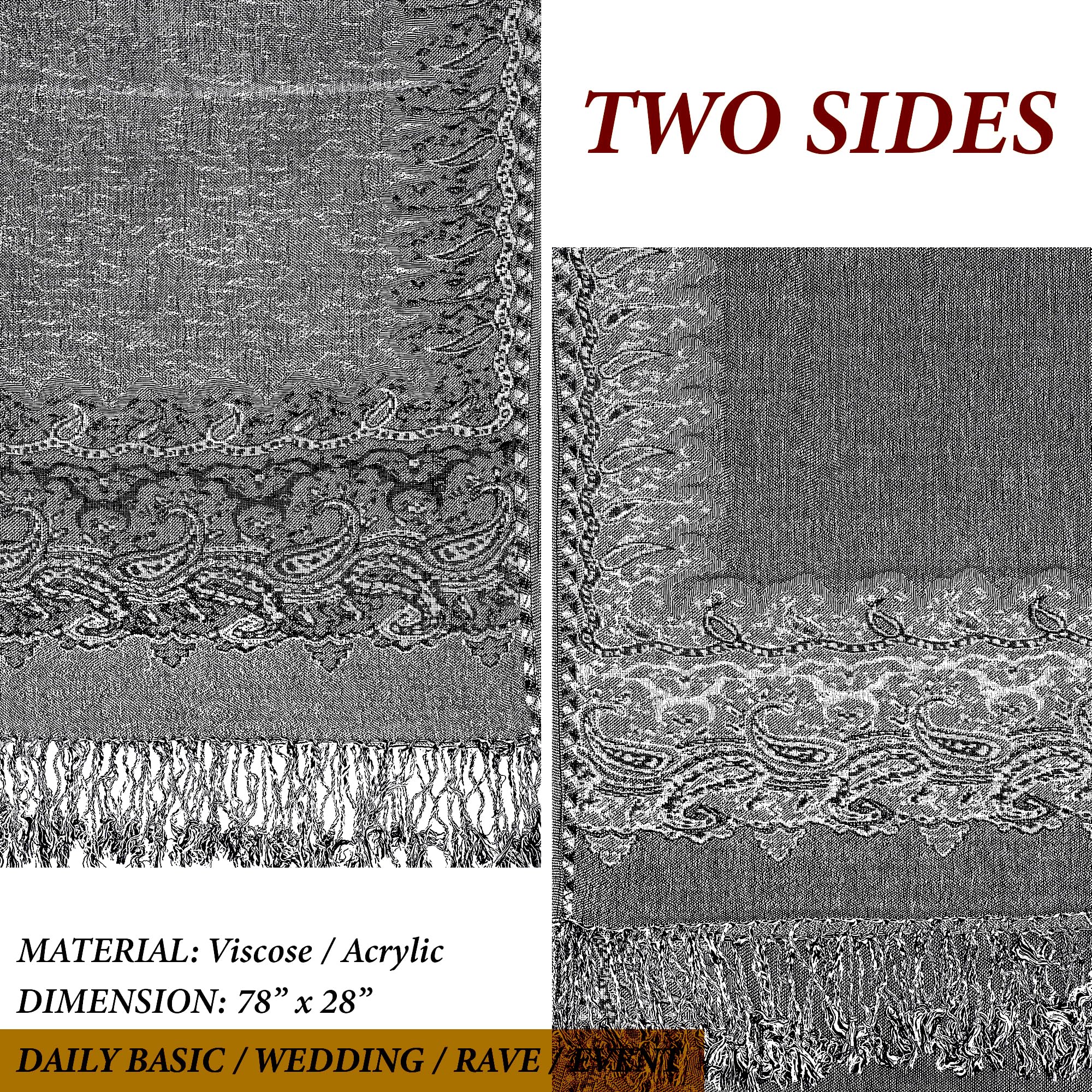 ✔️ Soft & Durable Jacquard Weave - This pashmina shawl is made of a fine viscose-acrylic blend with a detailed jacquard weave that highlights traditional paisley patterns. Measuring approx. 80" x 28" with fringe and weighing 9 oz, it offers a soft touch and moderate warmth without bulk.