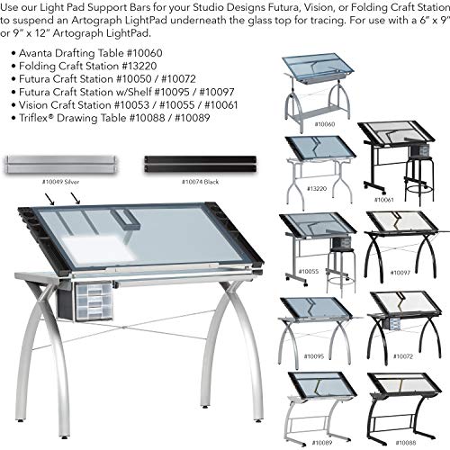 Need to use a light pad for your drawing or drafting? The Light Pad Metal Support Bars in Silver attach to the back of Studio Designs' glass top tables, suspending the light pad underneath, securing placement and preventing scratching. For use with any 6'' x 9'' or 9'' x 12'' light pads. Includes set of self-tapping screws. Designed for used with Studio Designs' Futura Craft Station in Silver/Blue Glass #10050, Vision Craft Station #10053, Vision 2-Piece Craft Center #10055 and Folding Craft Station in Silver/Blue Glass #13220. Also compatible with Futura Craft Station in Black/Clear Glass #10072 and Futura Jr. Craft Station in Black/Clear Glass #10092.