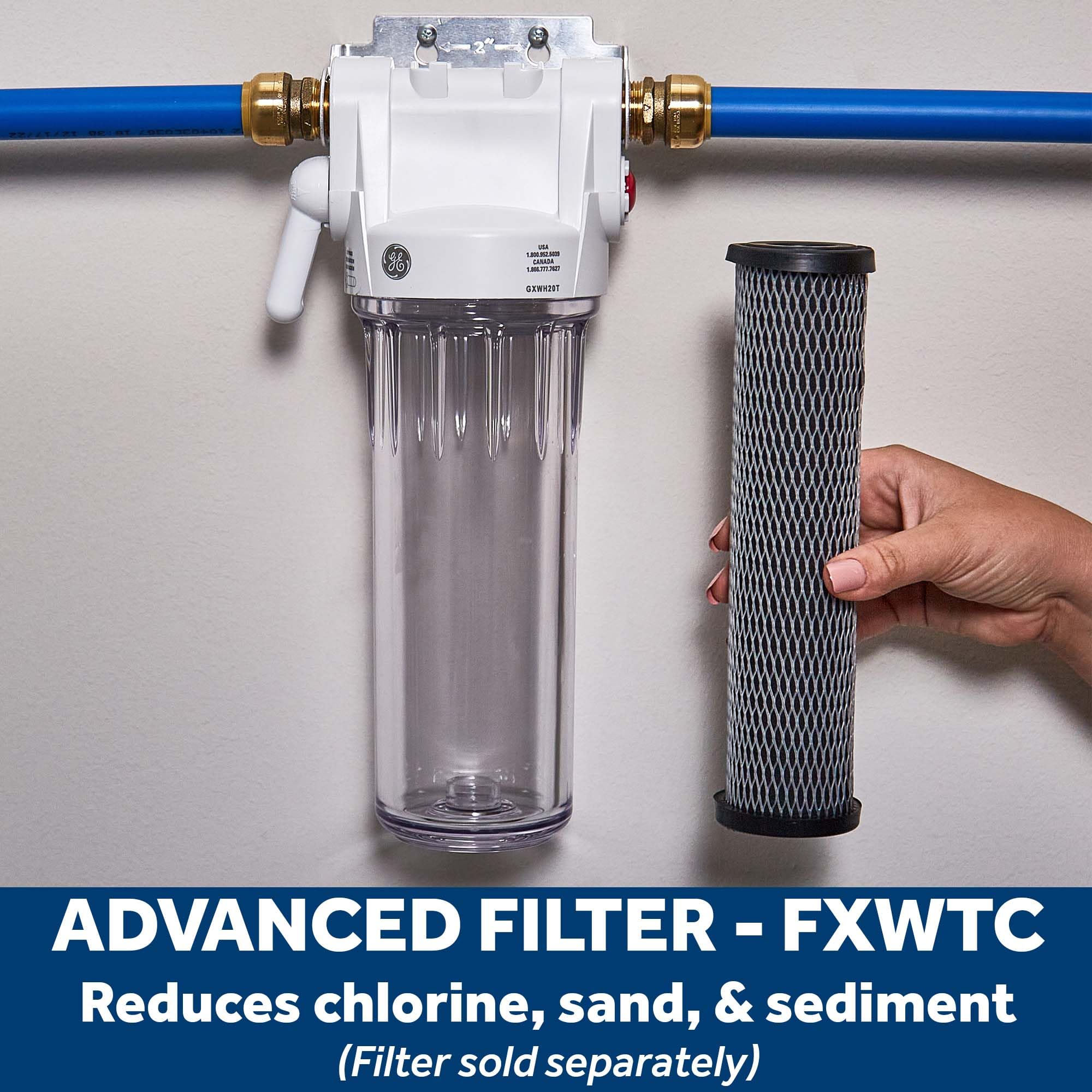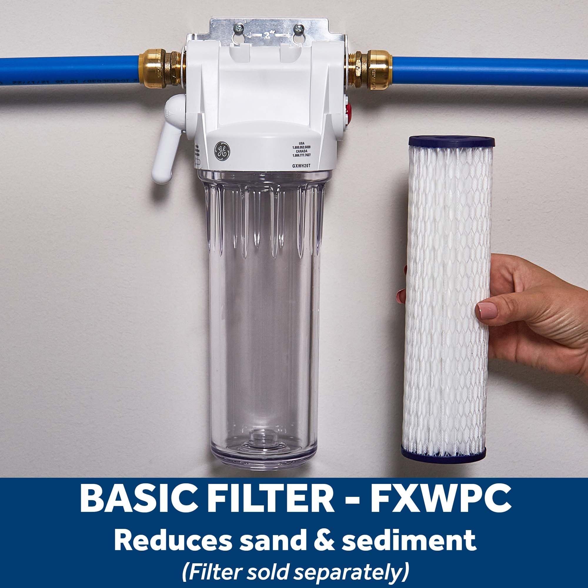 The GE Household Water Pre-Filtration System connects to 3/4 in. plumbing to filter out sand, sediment and rust from all your household water. The pre-filtration system features a 3-position bypass valve to allow you to change the filter without turning off your water supply. This water system helps to provide clean, clear water for showers, dishwashers and laundry.