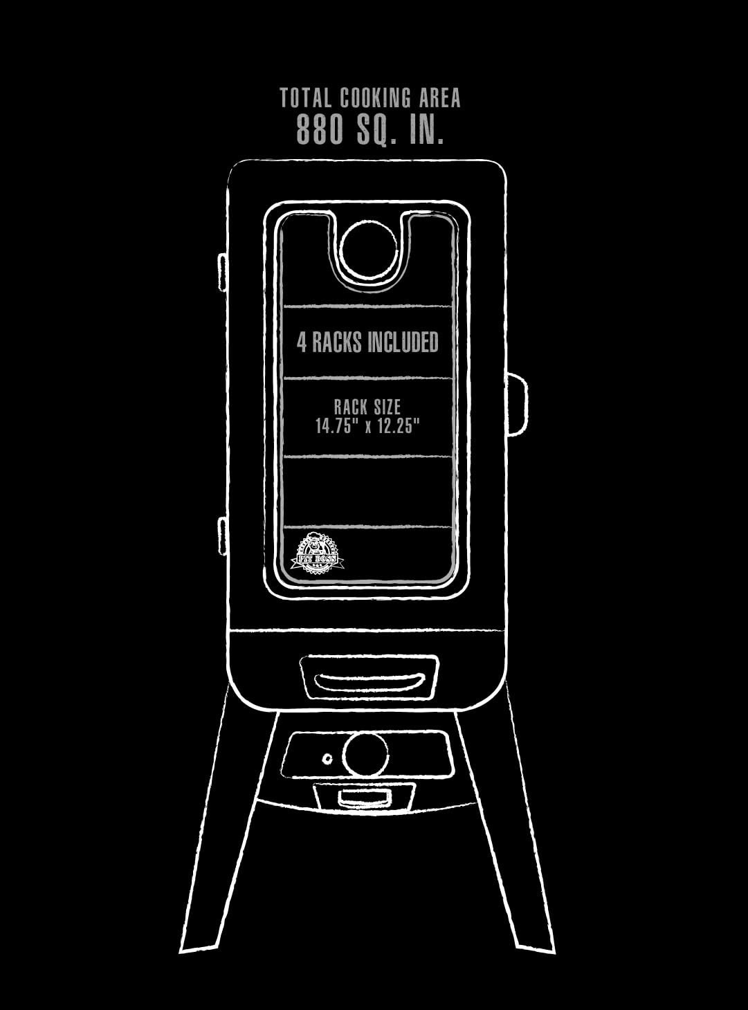 880 sq. inch cooking area; 4 racks that measure 14.75" x 12.25" each