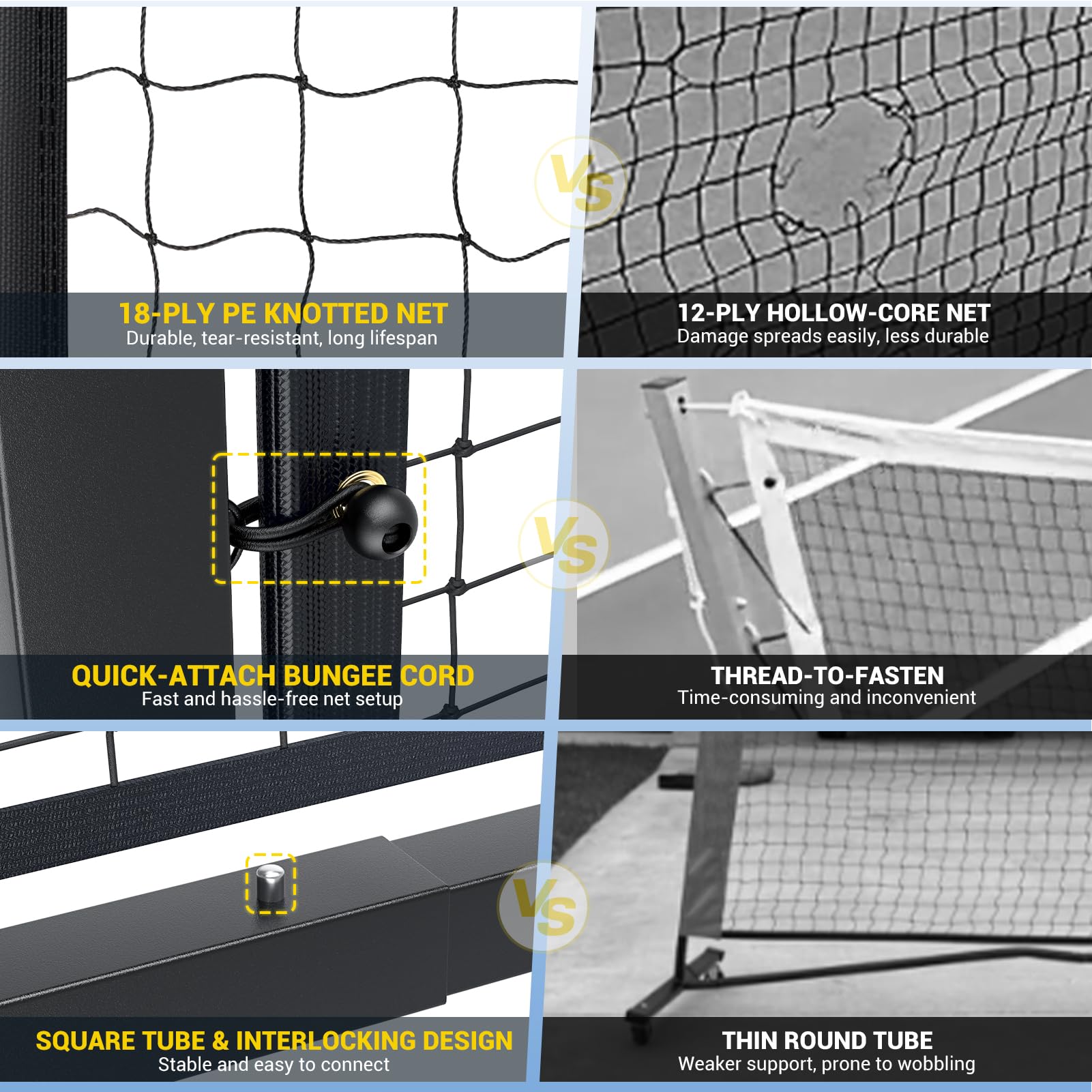 Quick & Hassle-Free Assembly: No Threading Needed – The net features pre-attached quick-tie points to eliminate rope threading, while metal buckle clips on the frame make base assembly fast and intuitive. Set up and start playing in just minutes.