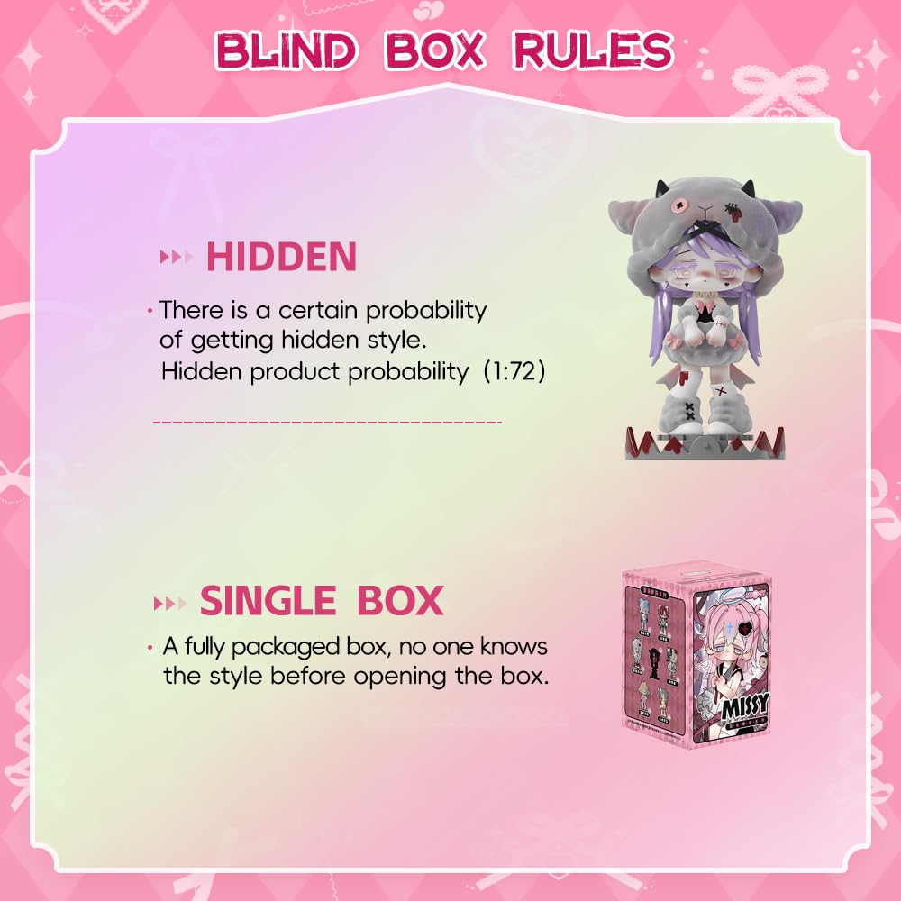 Blind box toys are collectibles that come in a sealed box, with the content unknown to buyers until they open it. This series has 6 regular figures, 1 general hidden edition (LOST LAMB). Each blind box is randomly arranged. You may get the hidden edition in any single box in probability (1/72 for LOST LAMB).