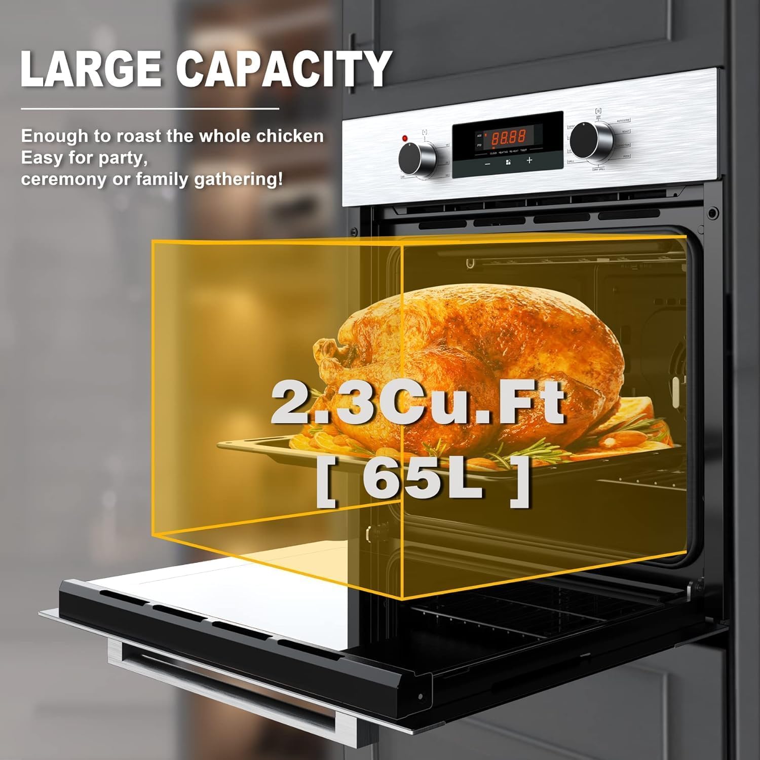 【SPACIOUS OVEN FOR WHOLE FAMILY】With 23 cu.ft of spacious cooking capacity, this 24-inch built-in oven lets you prepare delicious meals for the whole family with ease. Its sleek stainless steel finish and modern design make it a stylish addition to any kitchen, seamlessly blending with various decor styles while delivering both functionality and elegance