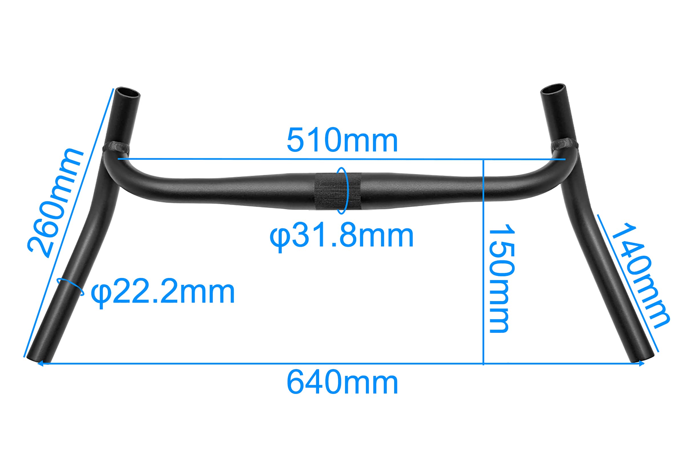 Middle diameter of handlebar :φ31.8mm Outer diameter of handlebar end :φ22.2mm Length of both handlebars: 270mm Handlebar width :640mm(25.2in) Middle section width of handlebars: 510mm(20in) Material: Aluminum 6061 Weight: 583.5g Color: Black Type:bike handlebars Pro Suitable model: Bicycle for travelling Packaging: 1 x handlebars Pro