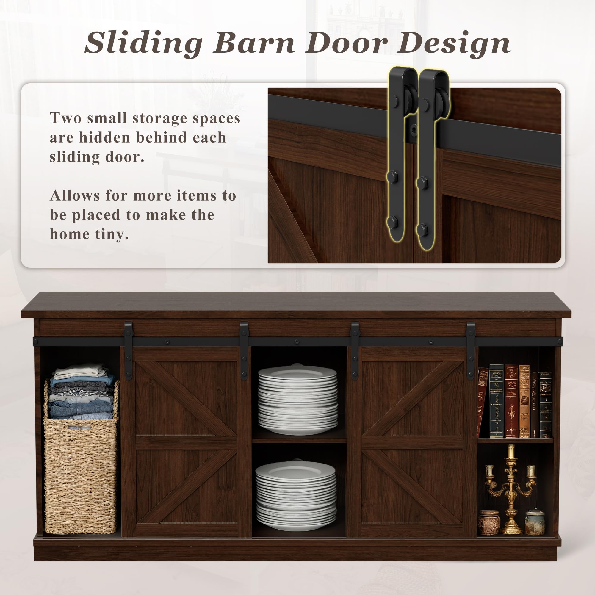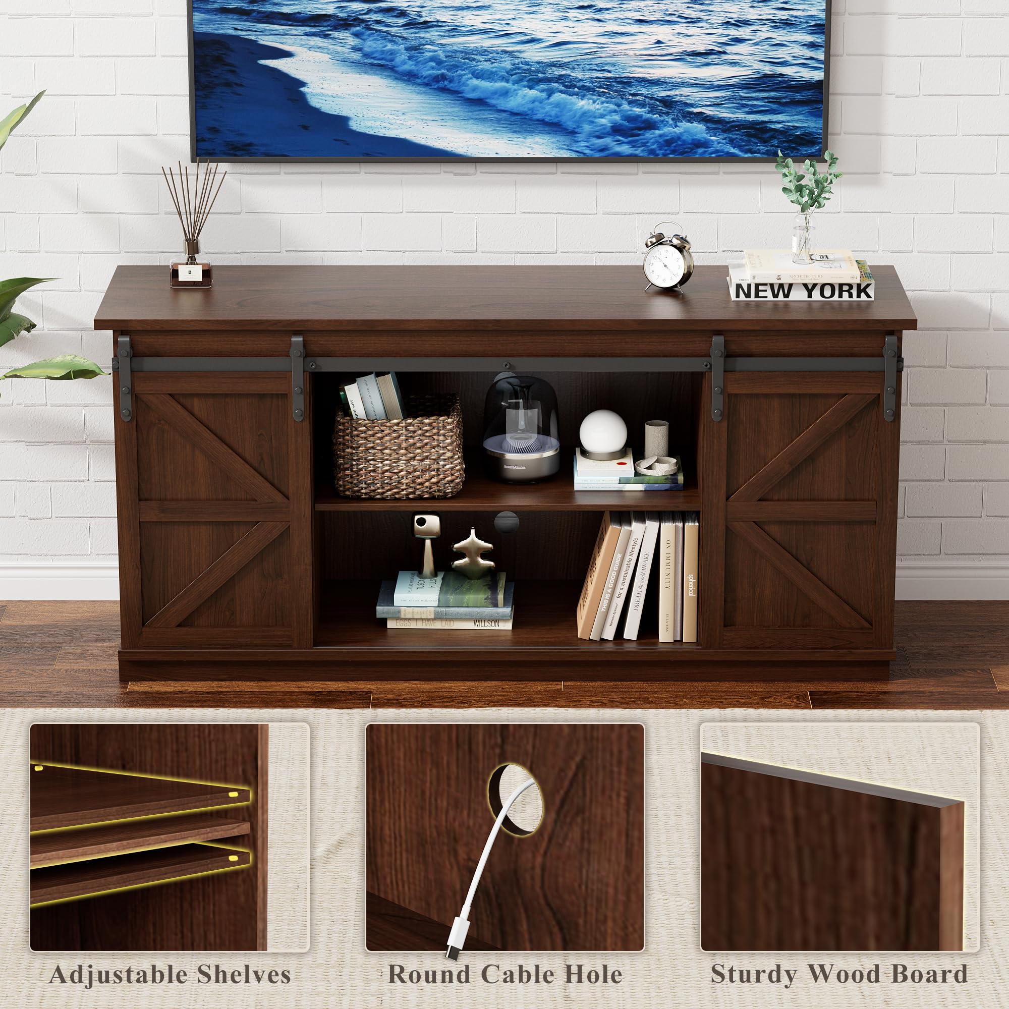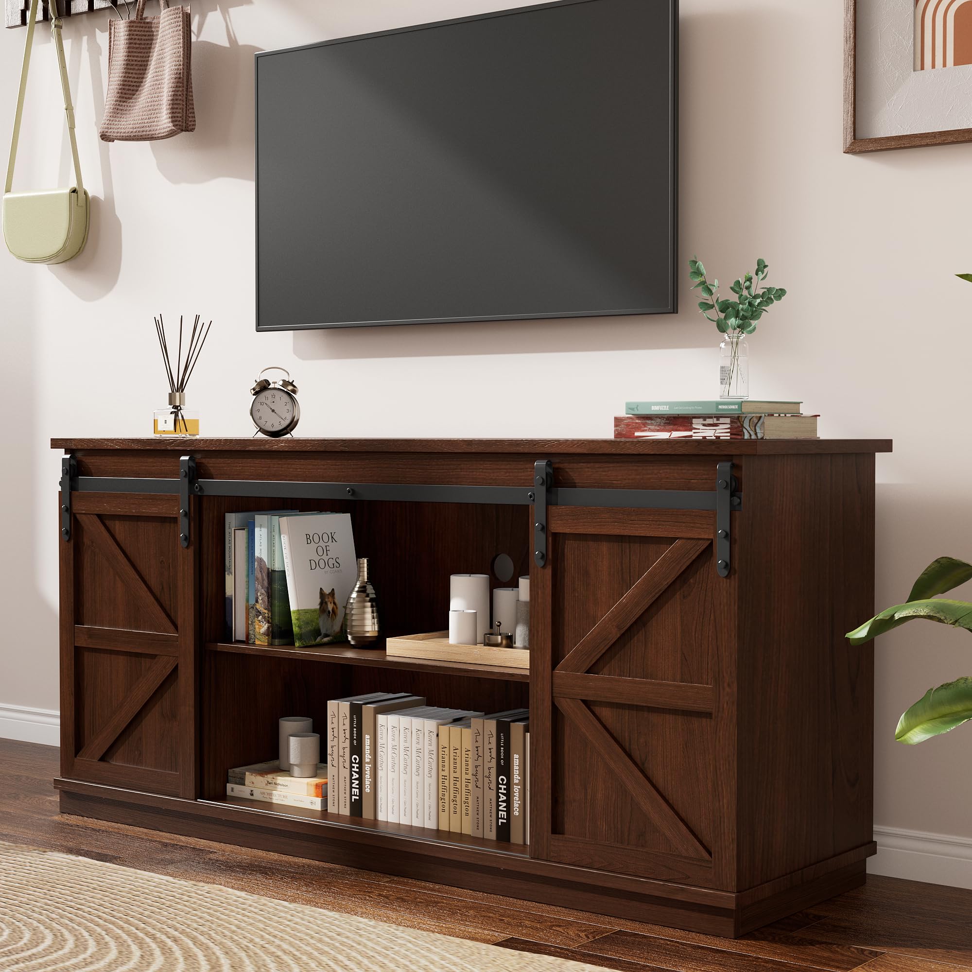 YESHOMY TV Stand Feature: TV stand is 27.6” H x 15.5” D x 58” L for TVs up to 65 Inches Two sliding doors can slide on metal rails to hide the storage cabinet Large storage space can hold more items, freeing up space in your living room Various styles to decorate your room, Create a comfortable home environment Drilling design which allows your electronic equipment power supplies to be easily Specification: Color: Espresso Material: Metal, wood, etc. Package Dimensions:63"(L) x 18.25"(W) x 6.25"(H) Package Weight: 81.3 lbs Package includes: A tool kit A tv stand A manual of installation and usage Notice: There may be some differences between photos and items in term of color because the influence of lighting during the shooting or the settings of the computers’ display screen.