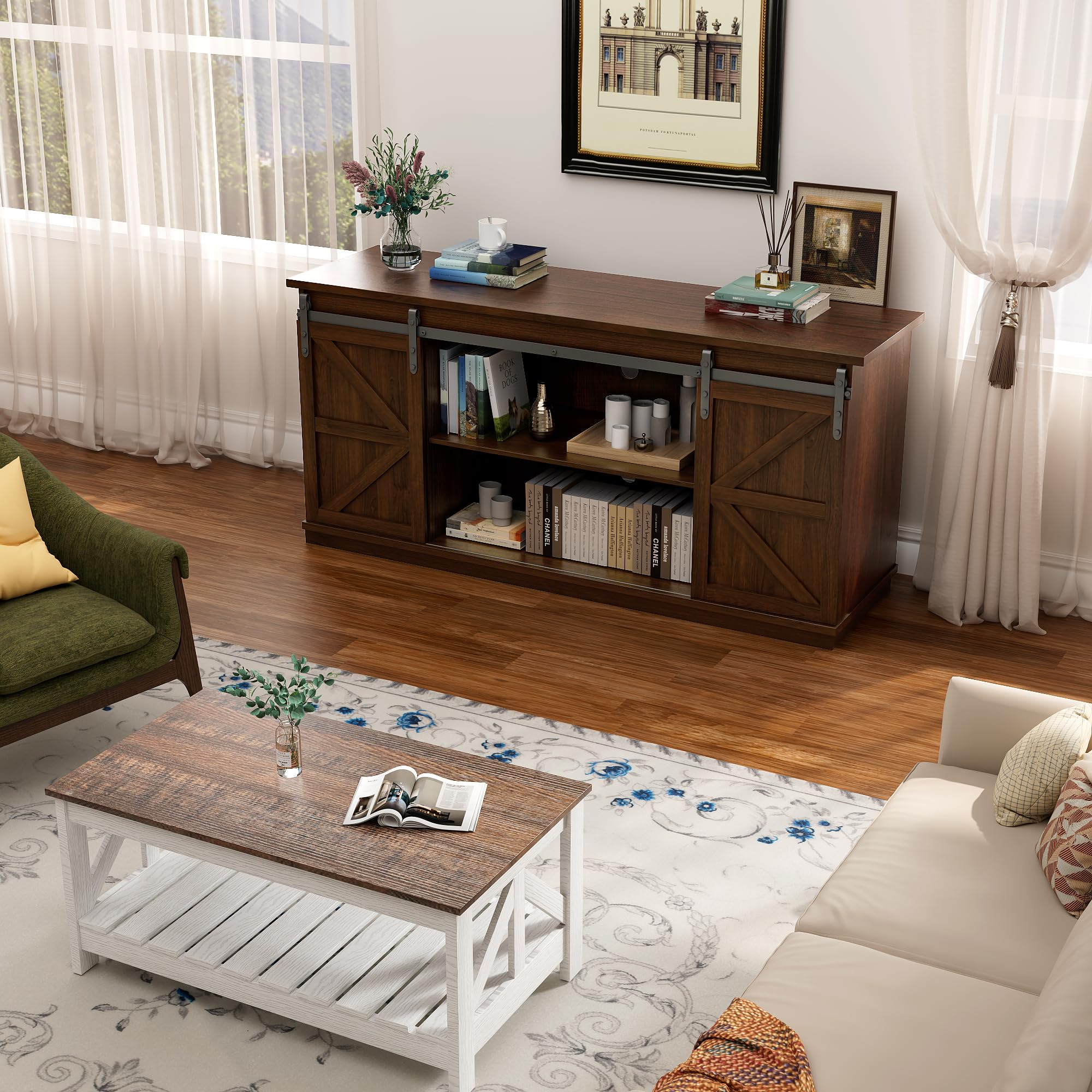Convenient Sliding Door: Two sliding doors can slide on metal rails to hide the storage cabinet or the central shelf, even if the inside of your TV stand is messy, it can be easily hidden