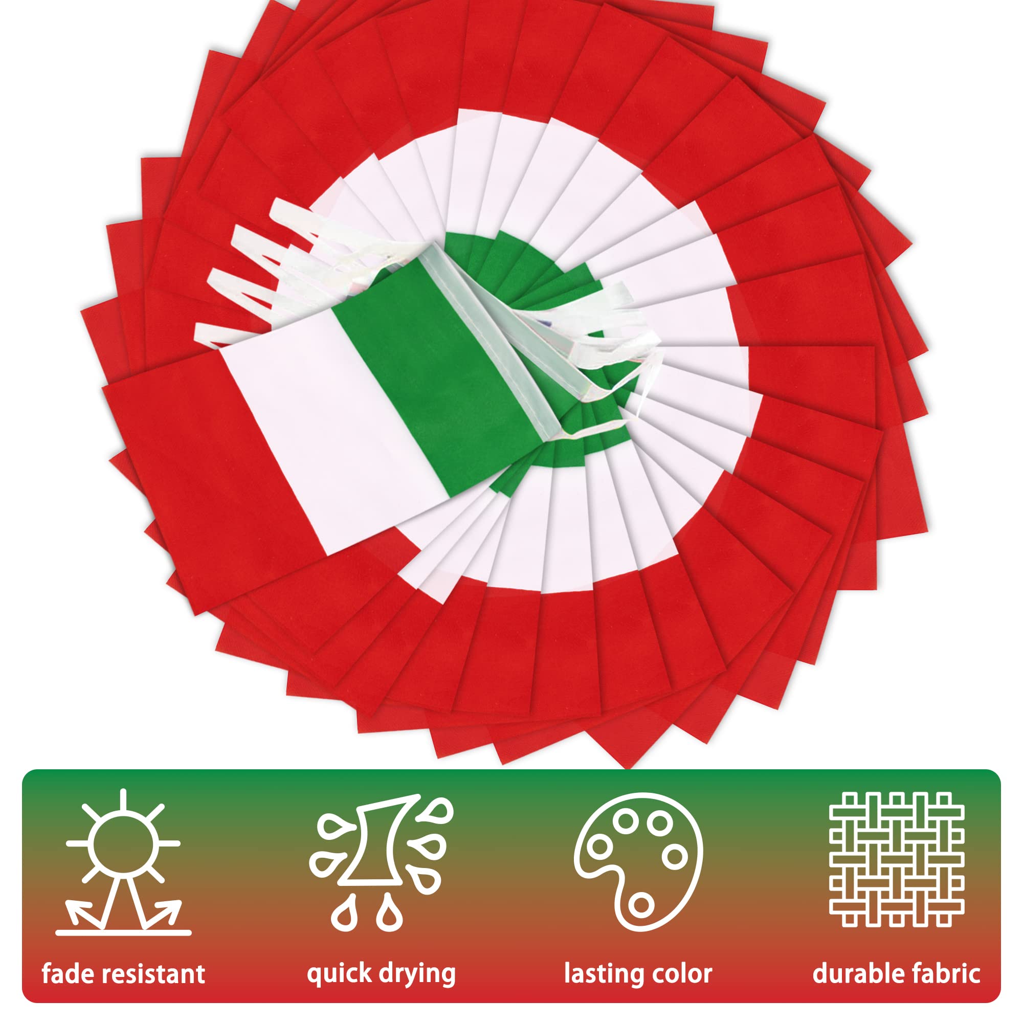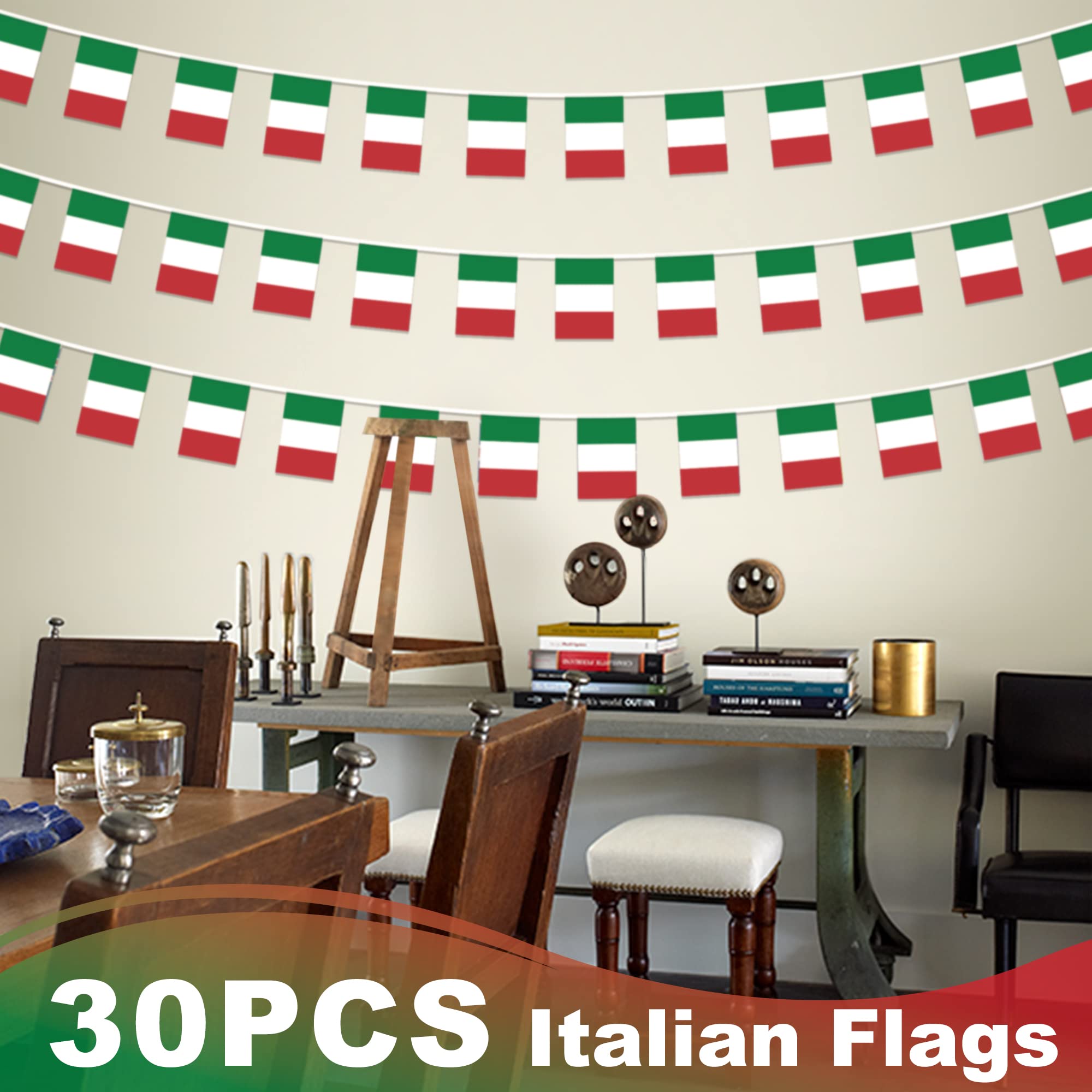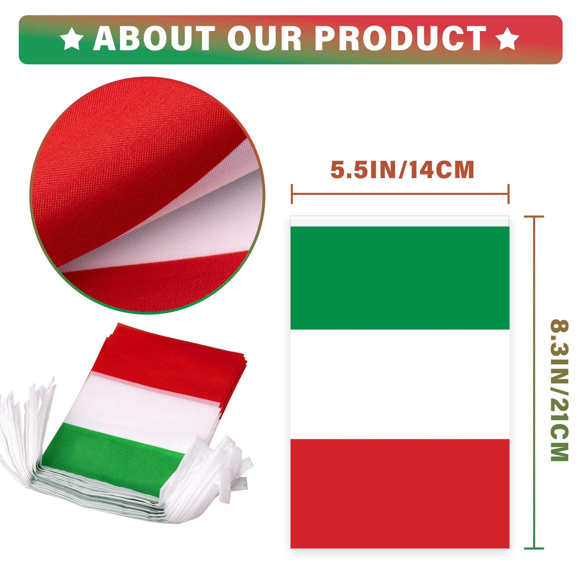 【Specifications】Each string is approximately 33 feet long. Includes 30 pcs Italian flags. Each flag is approximately 5.5 in wide and 8.2 in long.