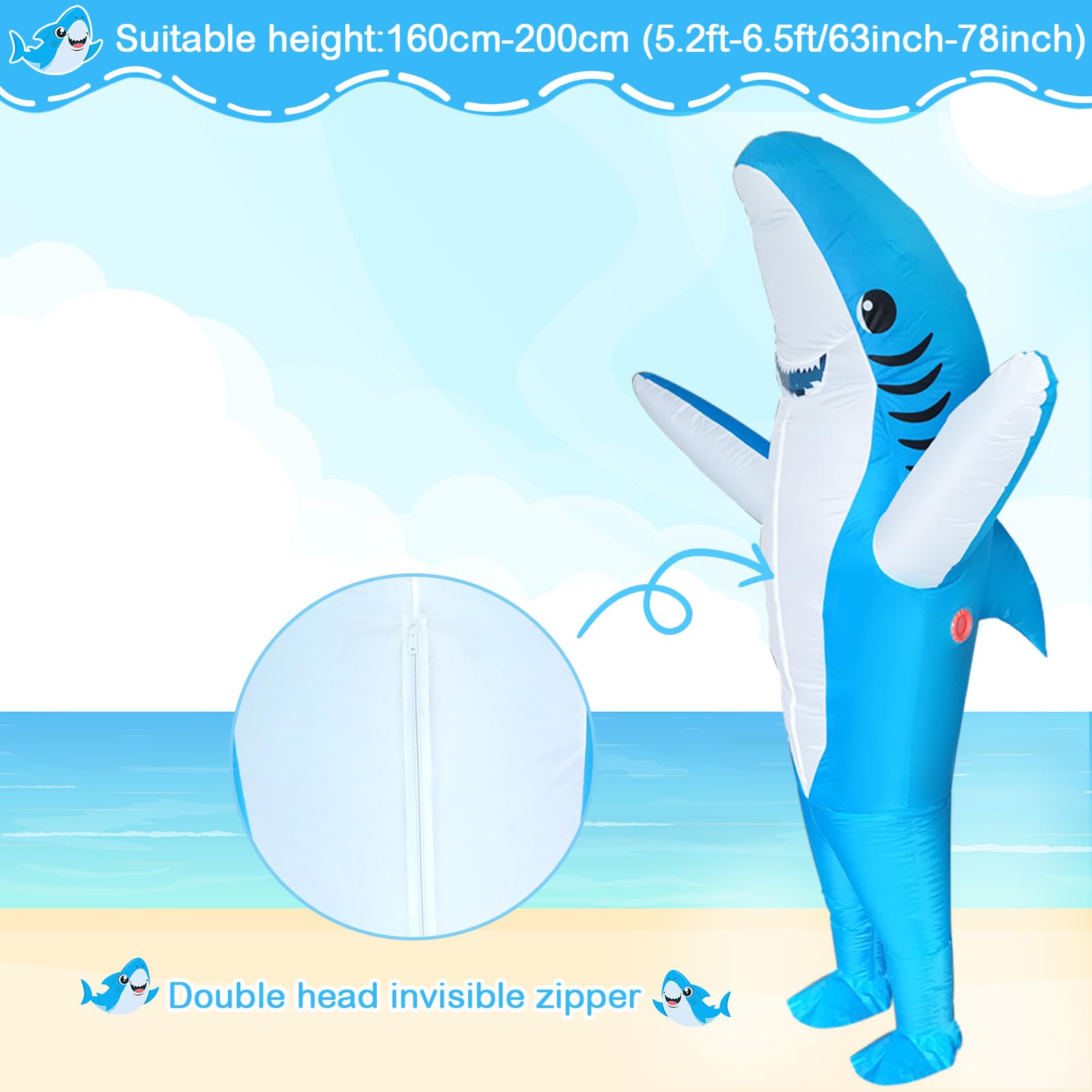 【BE THE WINNER OF EVERY COSTUME CONTEST】Get ready for this year's Halloween with these truly unique and hilarious inflatable costumes.Win every costume contest! Dress up as a shark, and draw everyone's attention on you!