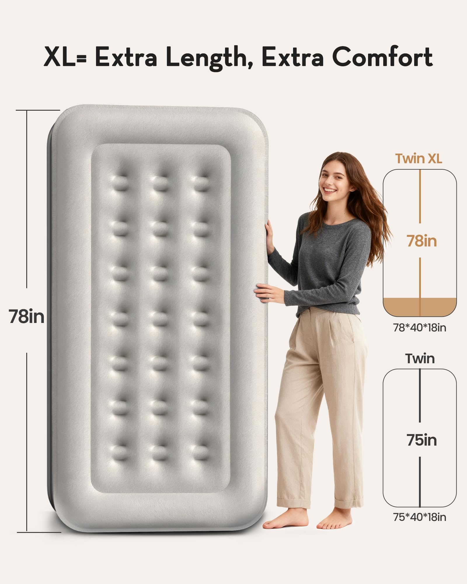 𝐒𝐩𝐚𝐜𝐞-𝐒𝐚𝐯𝐢𝐧𝐠 𝐃𝐞𝐬𝐢𝐠𝐧: The OhGeni Twin air mattress(78"x40"x18") delivers full-size comfort while saving space. It inflates in minutes to accommodate overnight guests and support up to 650 lbs. When not in use, simply deflate and pack it away in the included bag for hassle-free storage.