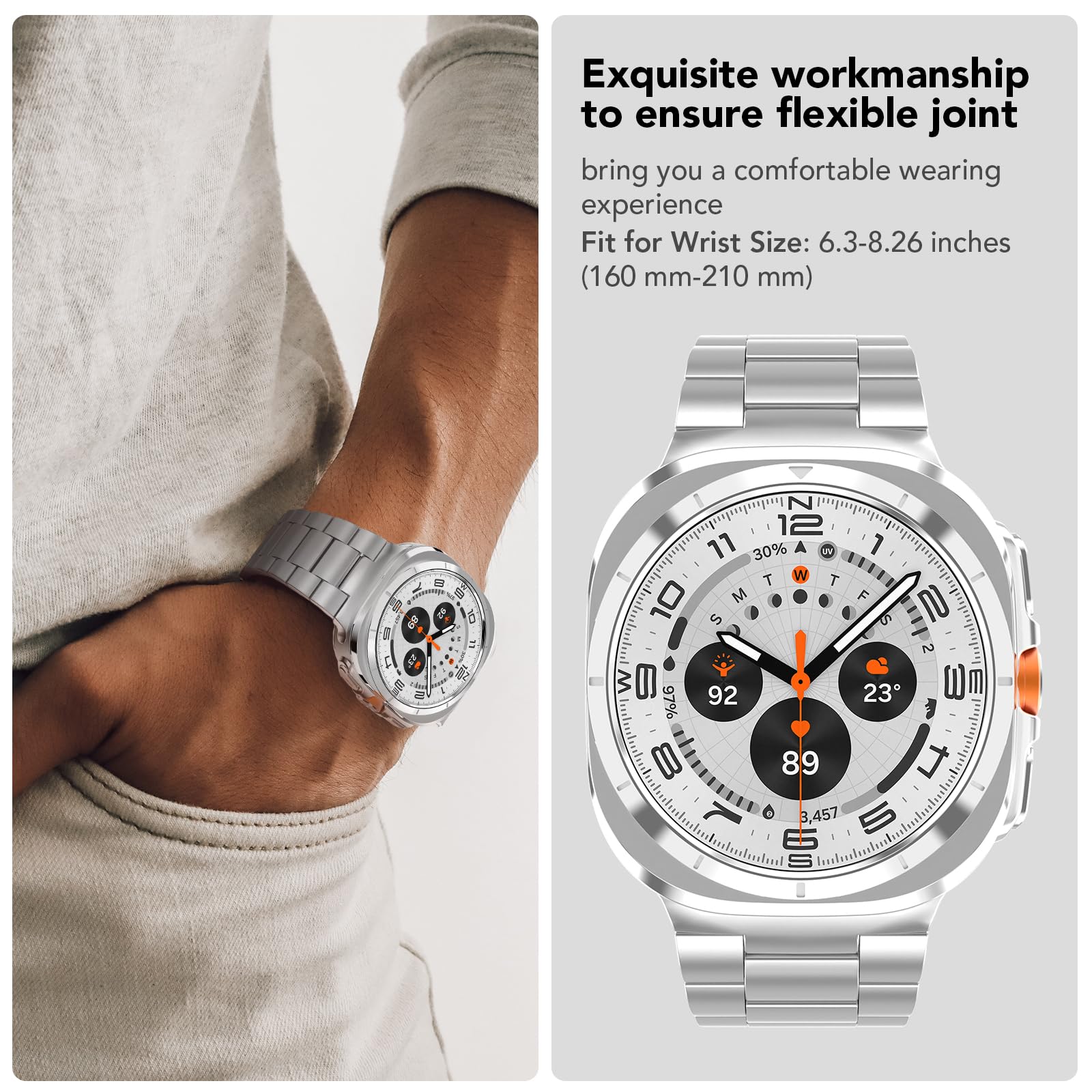 【Adjustable No Gap Band】!!! (PLEASE contact us if the package has no pins and other questions.) The length of Samsung Watch 8/7 ultra 47mm band can be easily adjusted to fit your wrist. Fit for Wrist Size:6.3"-8.26"(160mm-210mm). Extra links can increase the length of galaxy watch ultra bands. Easy to take a link out and easy to put back in.