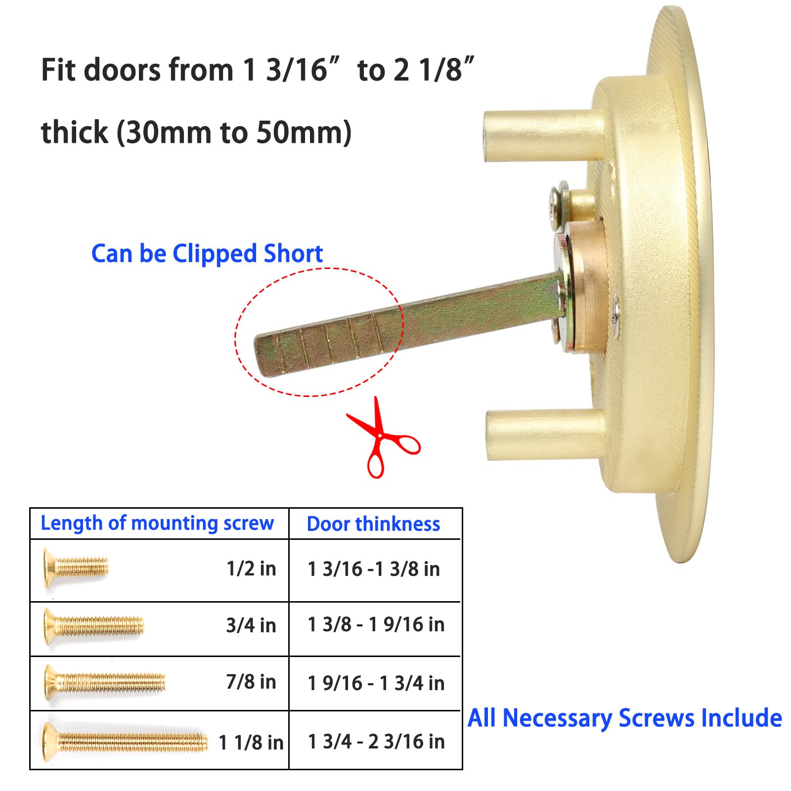 High Quality Material: Alloy steel with electroplated surface brushed nickel, and matte Black, corrosion resistant. Specification: 2-1/16” diameter hole, 1” diameter latch hole and 2-3/8” backseat.