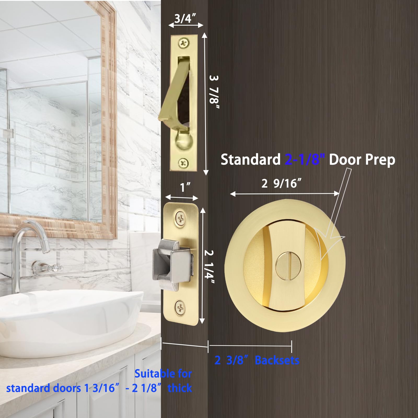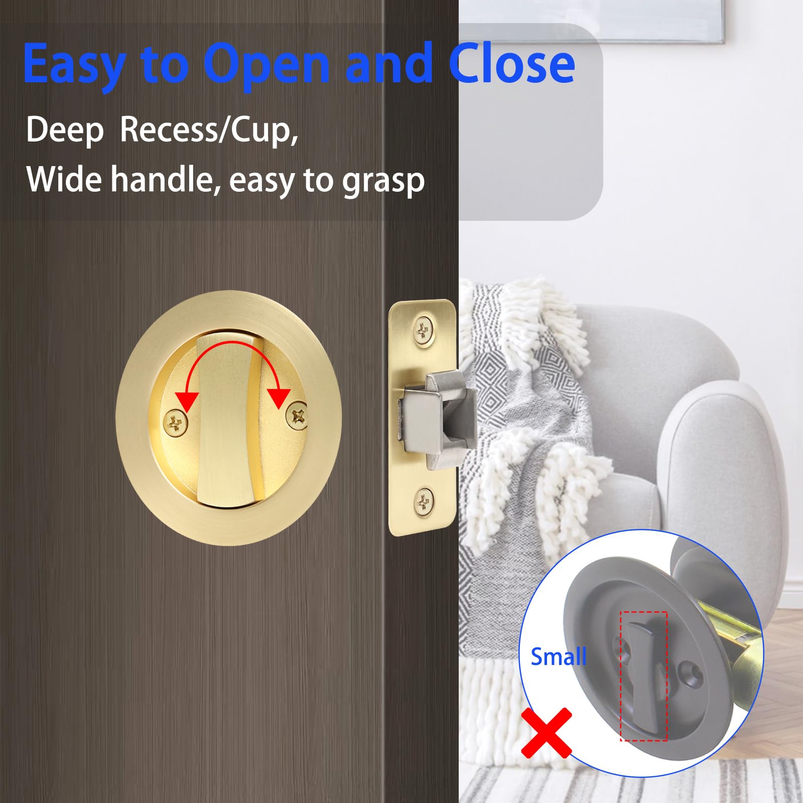 Large Locking Lever: Large locking lever make this lock user-friendly and accessible to people of all ages and abilities.This pocket door privacy lock and pull has a wide, easy grip design and is for left or right handed doors.
