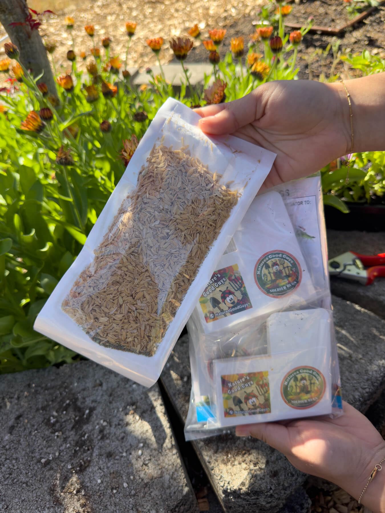 We have an everlasting supply of these insects. Farm fresh eggs harvested daily. Simply distribute the rice hulls and lacewing egg mixture into the small hanging bags provided then hang the bag in the infested area. Hang in the shaded part of plant to protect from rain and sun. NaturesGoodGuys, a.k.a Soldier Bugs, Green Lacewings are effective in a wide range of growing temperatures and humidities. Green Lacewings can be used indoors or outdoors. Green lacewings do not migrate, thus making them your best dollar value. Application: 1-5 lacewings per sq.ft. of planted area. Description: lacewings eggs typically hatch within 7-14 days, depending on the temperature. The lacewing larvae live 15-20 days, pupate and become an adult for 2 months. While as an adult, the lacewings fly around and lay eggs near infested plants. Note: We recommend releasing the same day as received. Release Rates: Interiorscape: 1,000 eggs per 500 sq. feet; Gardens: 1,000 eggs per 2,500 sq. feet; Field Crops: 5,000 per acre.