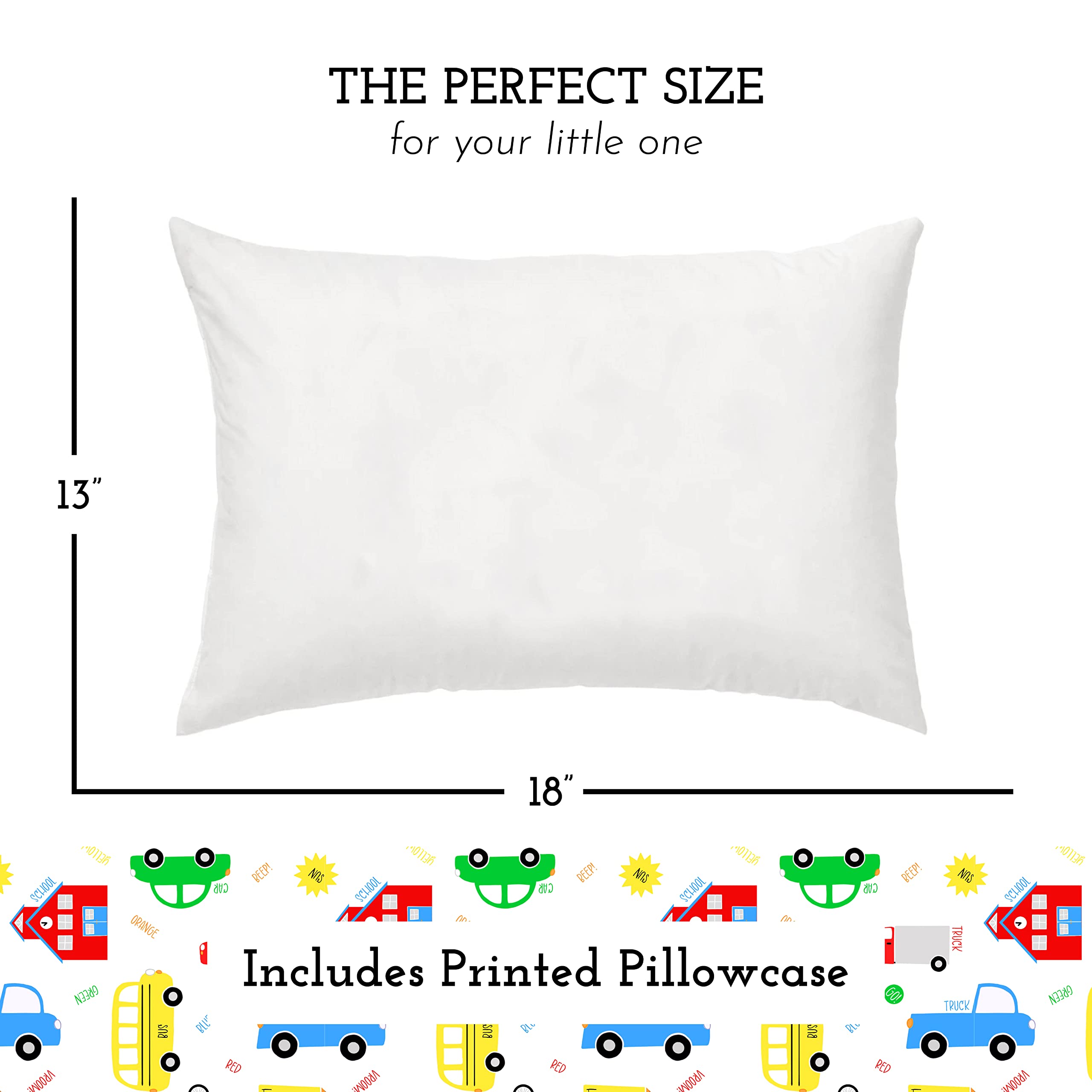 13" x 18" Toddler Pillow and Pillowcase - This snugly, take-it-everywhere he or she goes small pillow is THE perfect size and softness for your toddler! Our children's pillows are just right for their toddler bed too! Available in a variety of colorful designs that appeal to kids, the Little Sleepy Head toddler bedding set ensures sweet dreams wherever they lay their head.