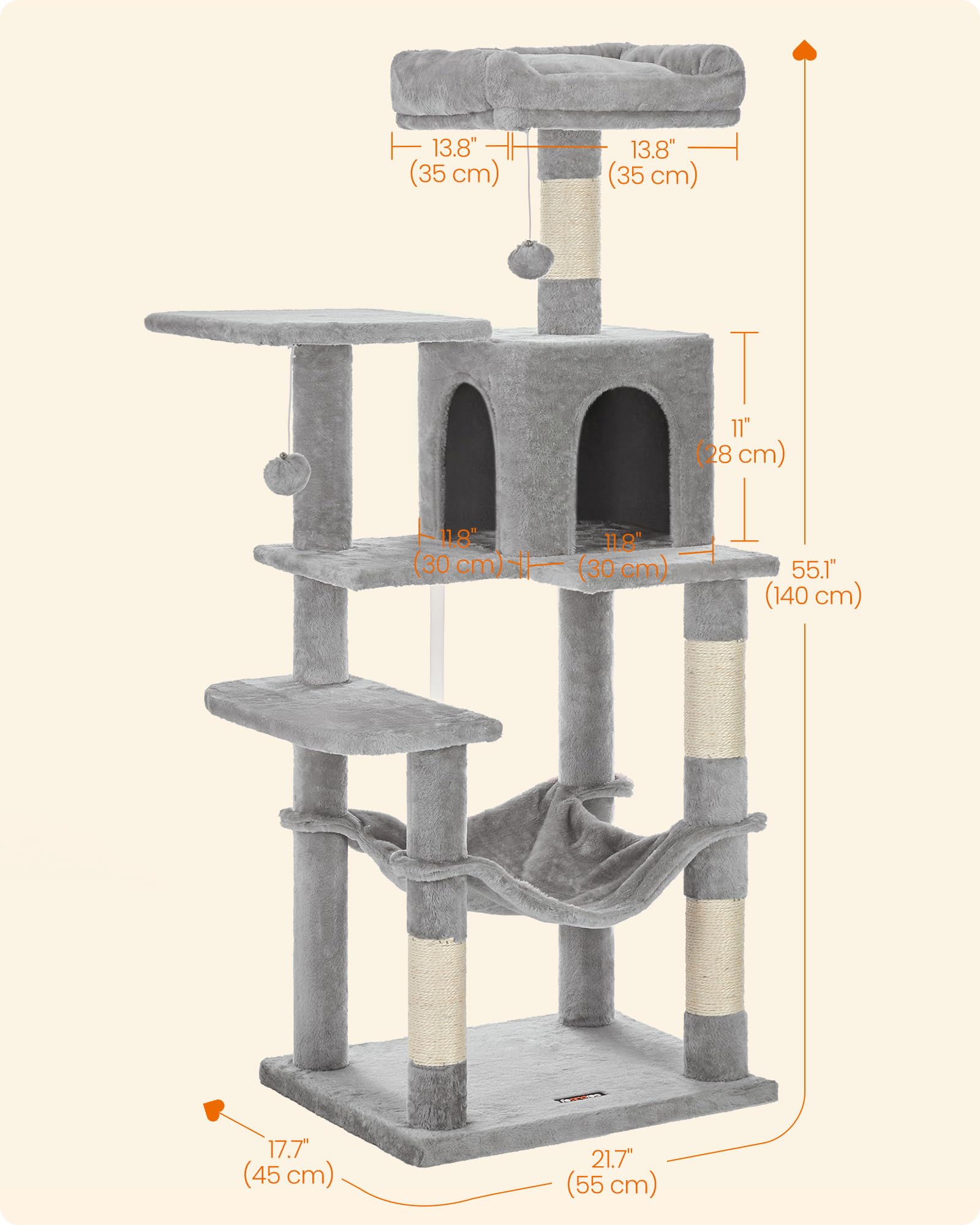 For Multi-Cat Households: Featuring 2 top perches and a comfy cat cave, this cat tree offers multiple cozy places for each of your little furballs to nap and relax