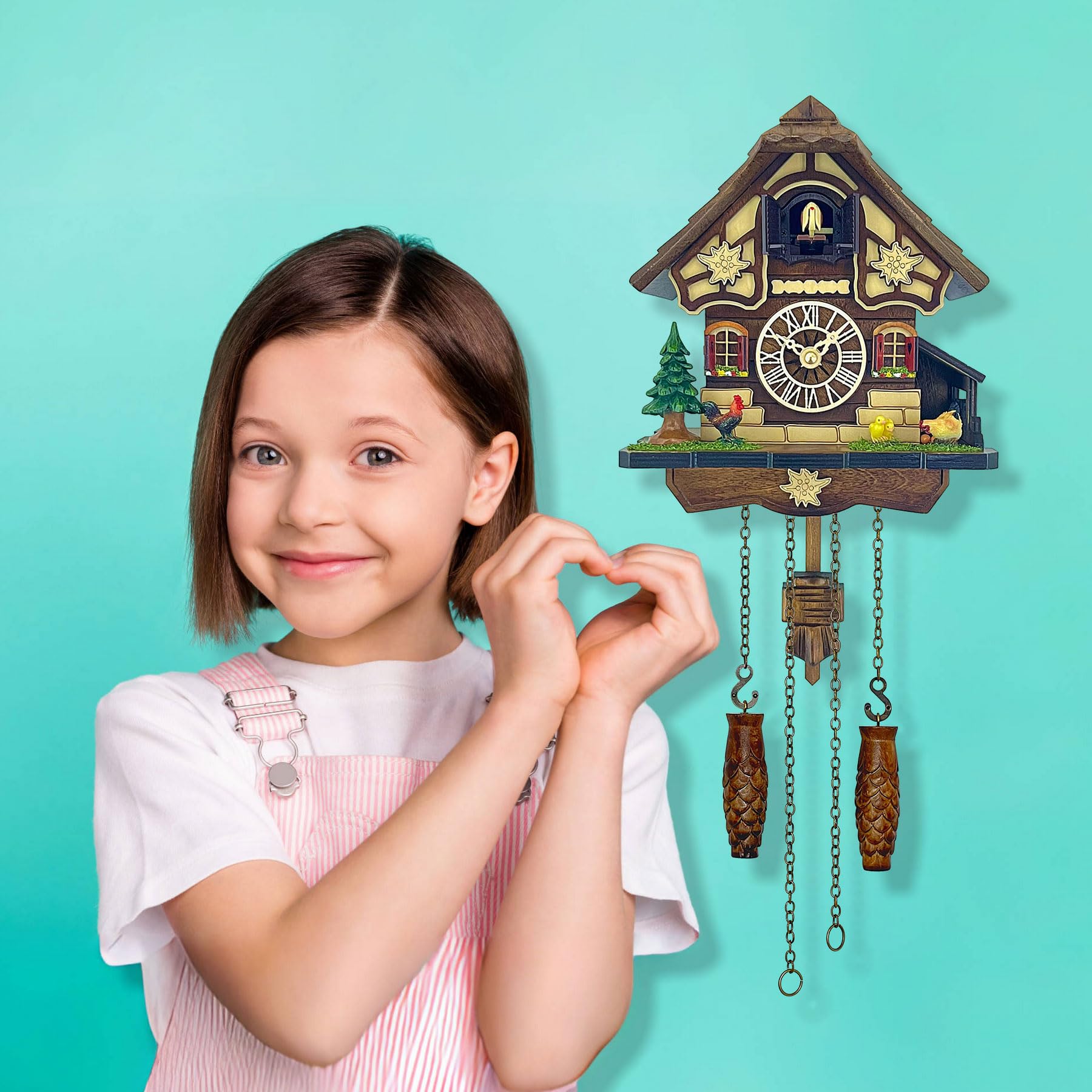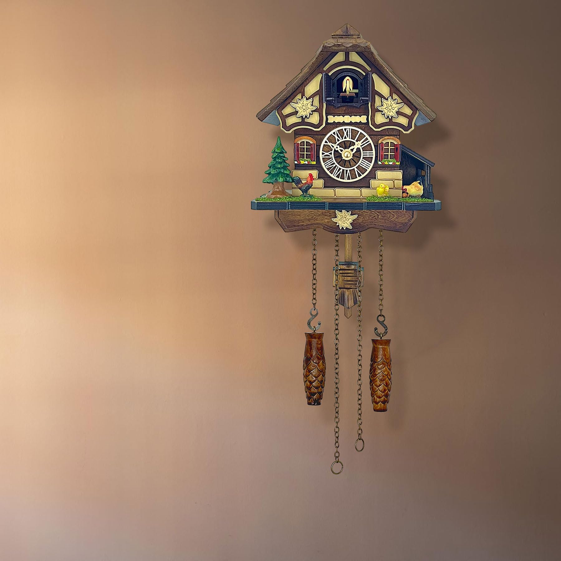Charming Chicken Family Design – This handcrafted cuckoo clock features a loving chicken family with a rooster, hen, chicks, eggs, a cozy henhouse, and a charming pine tree—perfect for adding warmth and storytelling to any room.