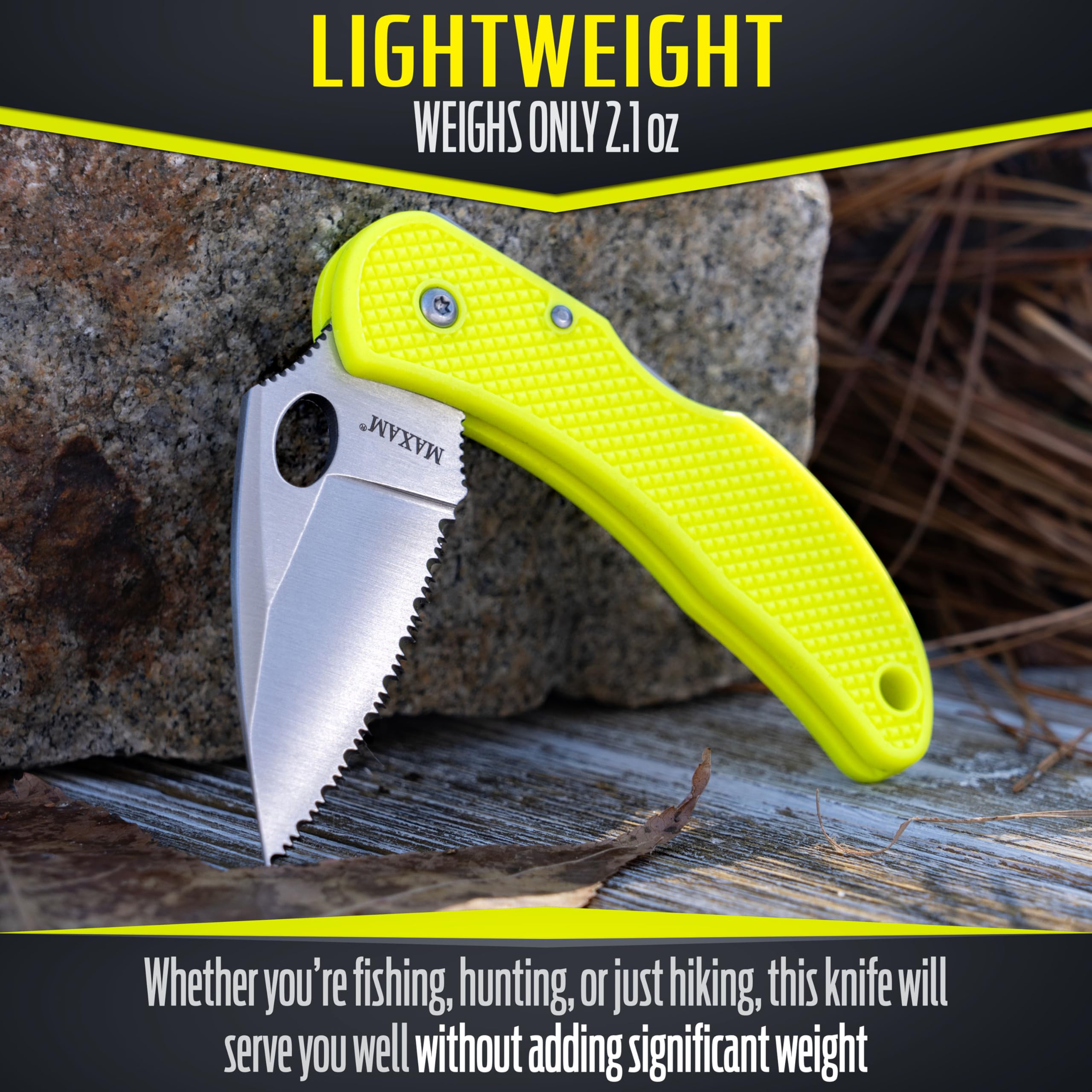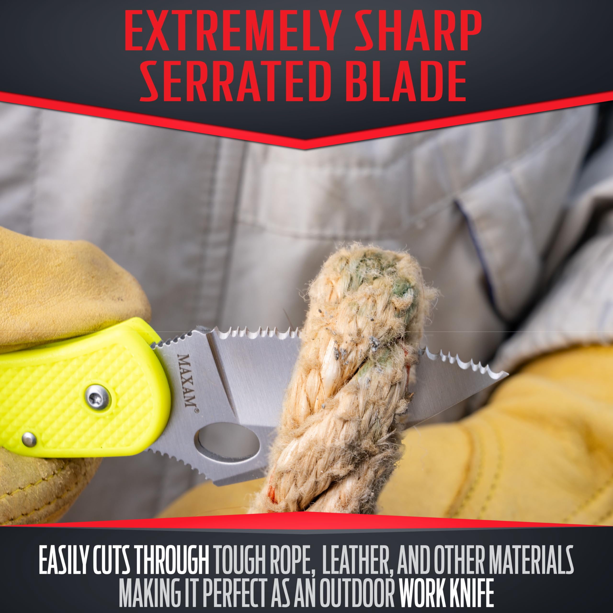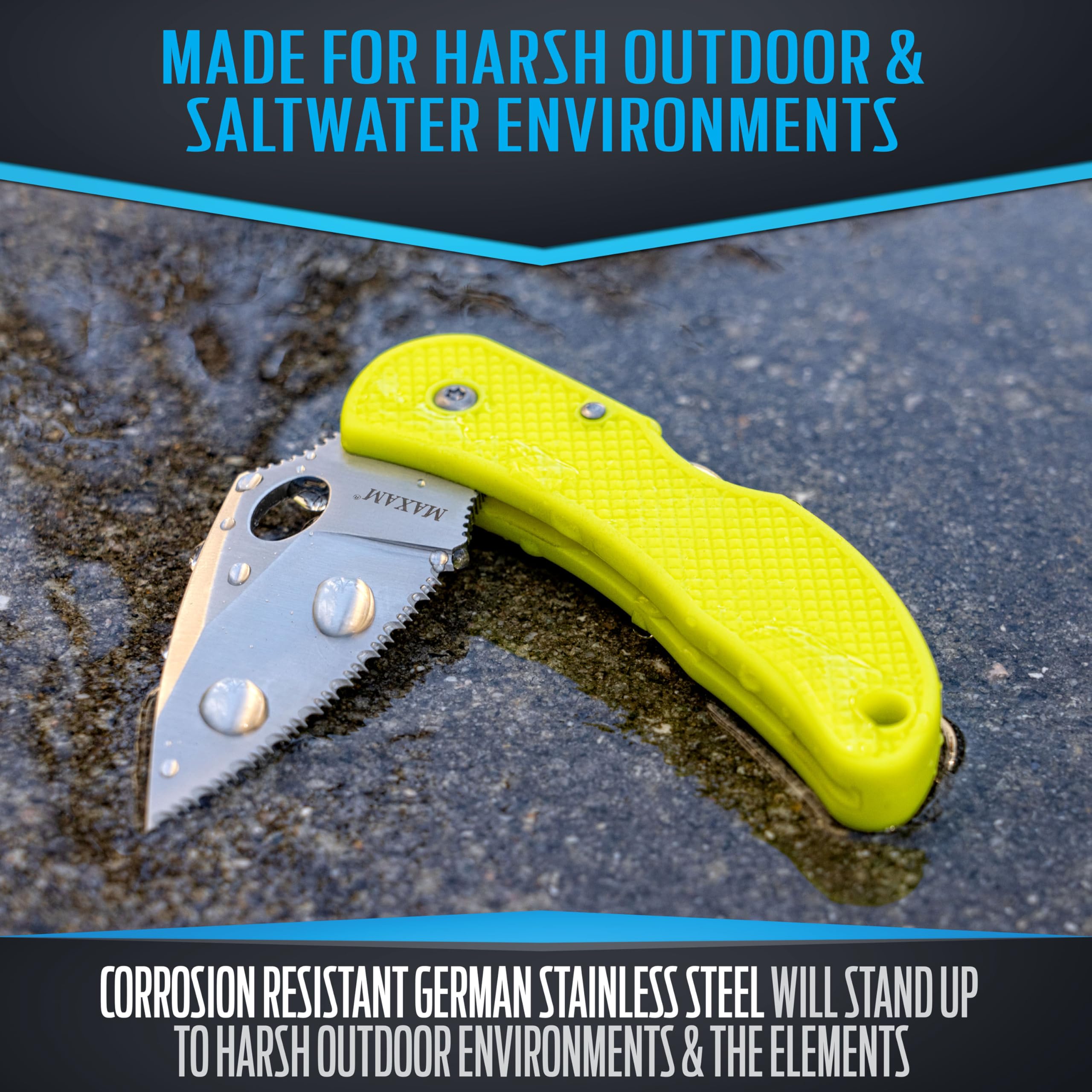 Effectively Cuts Without Snagging - The serrated German Stainless steel blade of this saltwater fishing knife easily cuts through ropes, seatbelts, webbing, and other materials without getting caught.