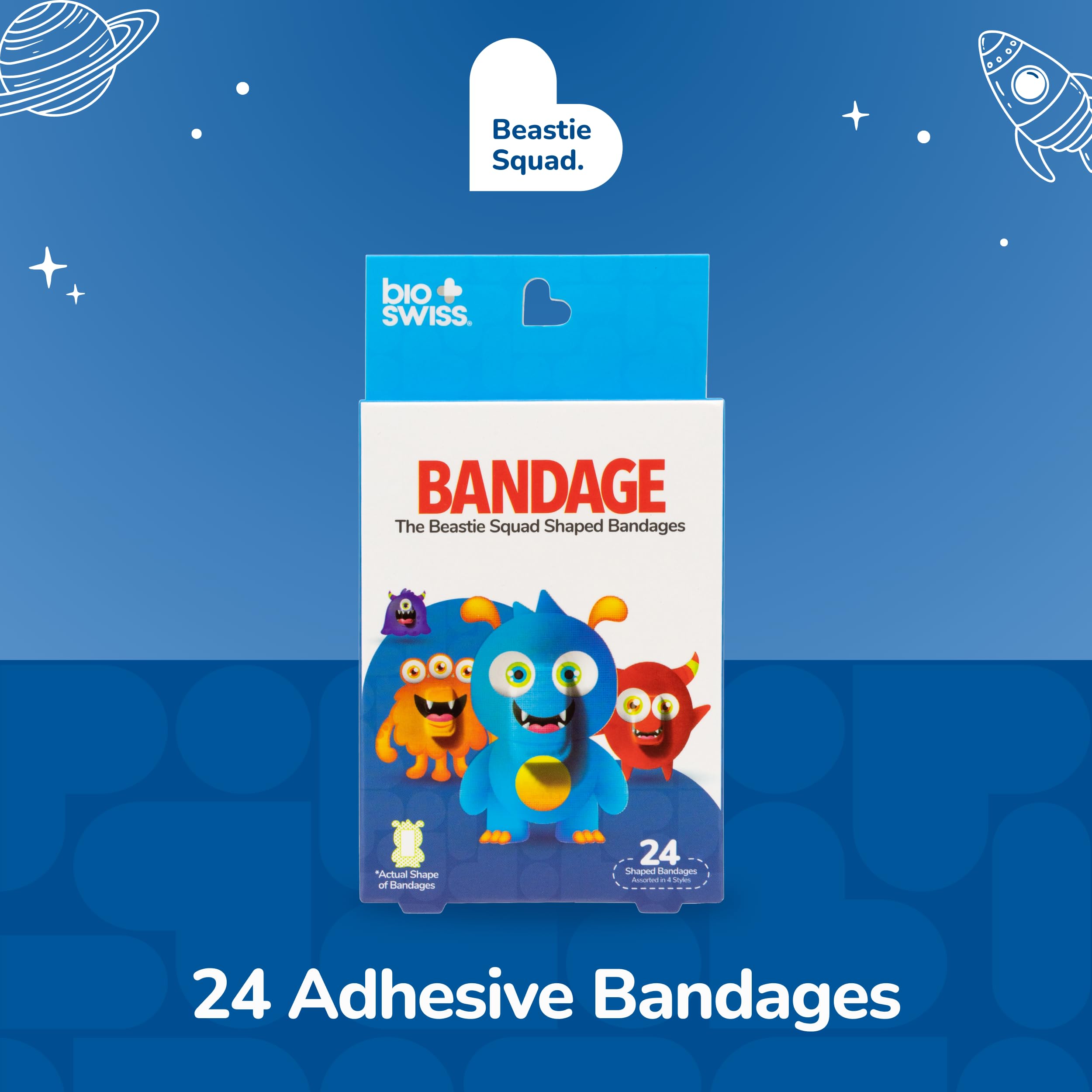 24 BEASTS BANDAGES: Beast-shaped adhesive bandages pack helps protect cuts, scrapes, and minor wounds while making healing less stressful; bandages come in 4 assorted styles