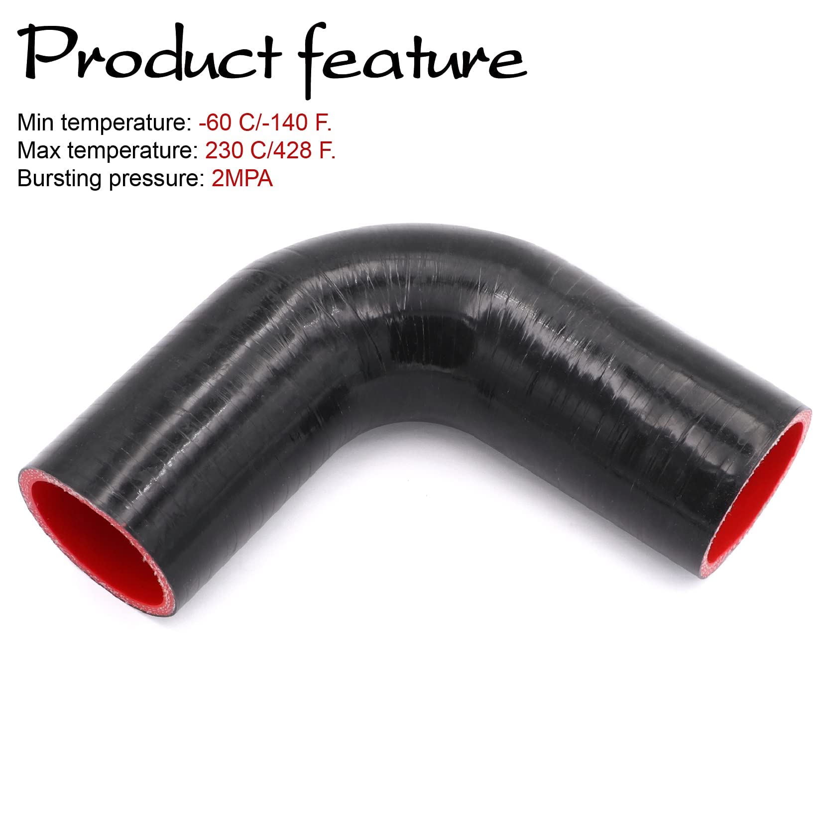 Silicone 4-Ply 90 degree silicone hose, Inner Diameter: 2"(51mm). Length: 102mm one leg. Thickness: 5mm. Size tolerance: +/- 0.5MM.