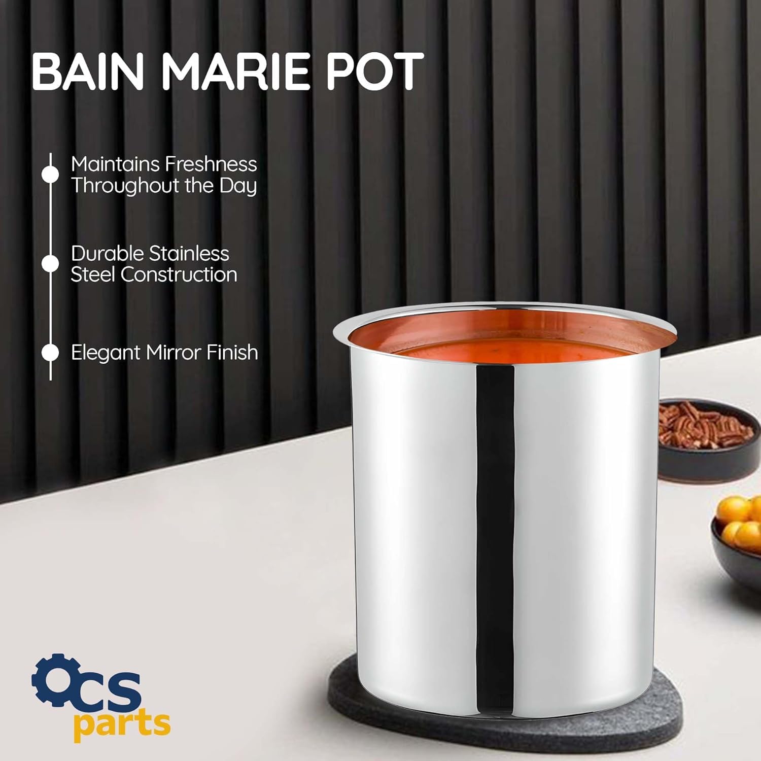 Serve up your best dishes with the OCS Parts Bain Marie Pot. Made from durable 18/8 stainless steel, this pot is perfect for keeping food fresh and at the ideal serving temperature throughout the day. Its versatile design allows for use alone, in soup warmers, salad and buffet bars, or steam tables, making it suitable for both hot and cold temperature retention. The bright, elegant mirror finish adds a touch of sophistication, while the durable construction ensures longevity. Heat and store food in the same container for added convenience, and enjoy easy cleanup by simply sealing the pot after use. This bain marie pot is an essential addition to any kitchen, perfect for sauces, soups, and organizing cooking utensils.