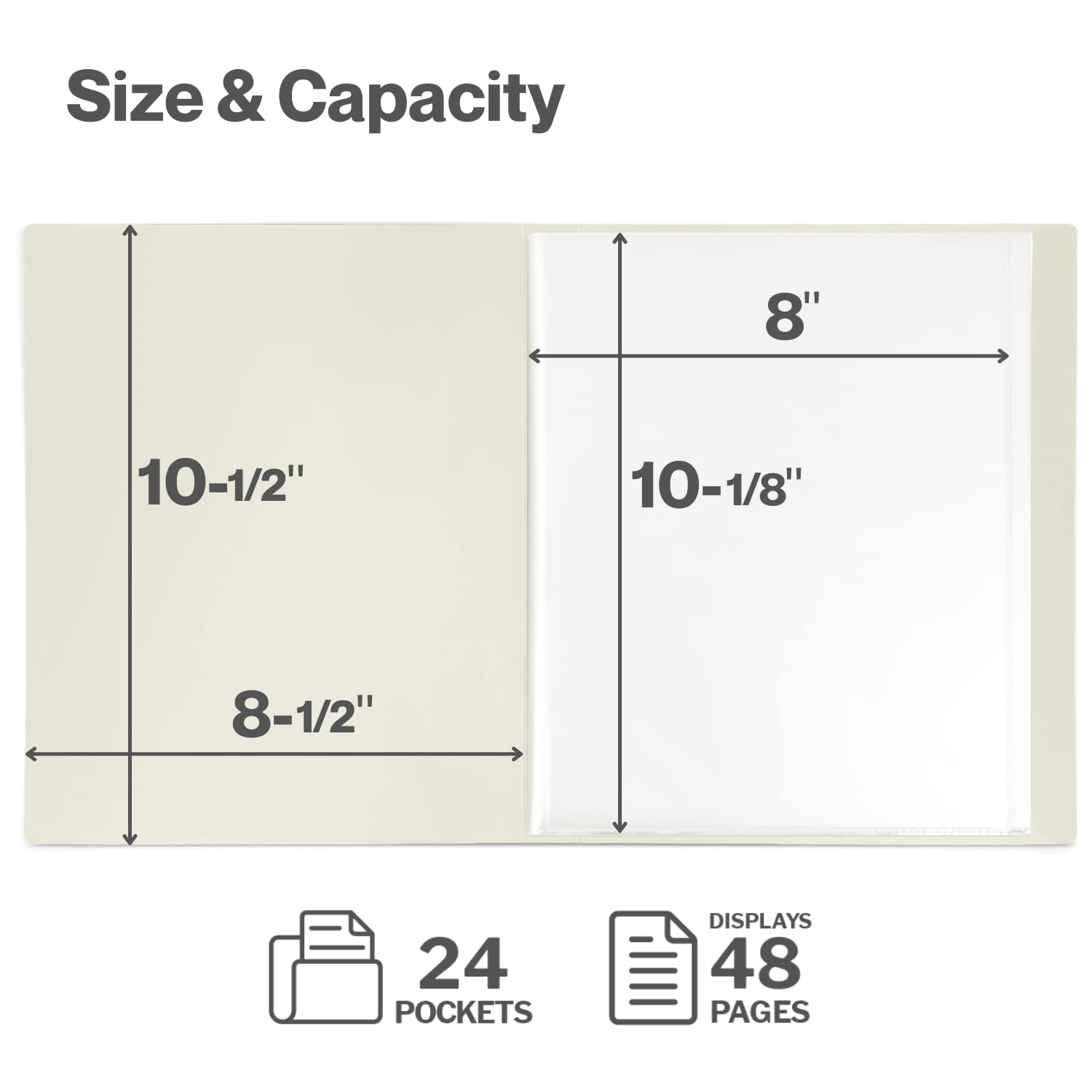 24 Clear Poly Sleeves: Plastic 8x10 binder has 24 bound (non-refillable) top-loading binder sleeves, folder displays 48 viewable pages of 10x8 content.