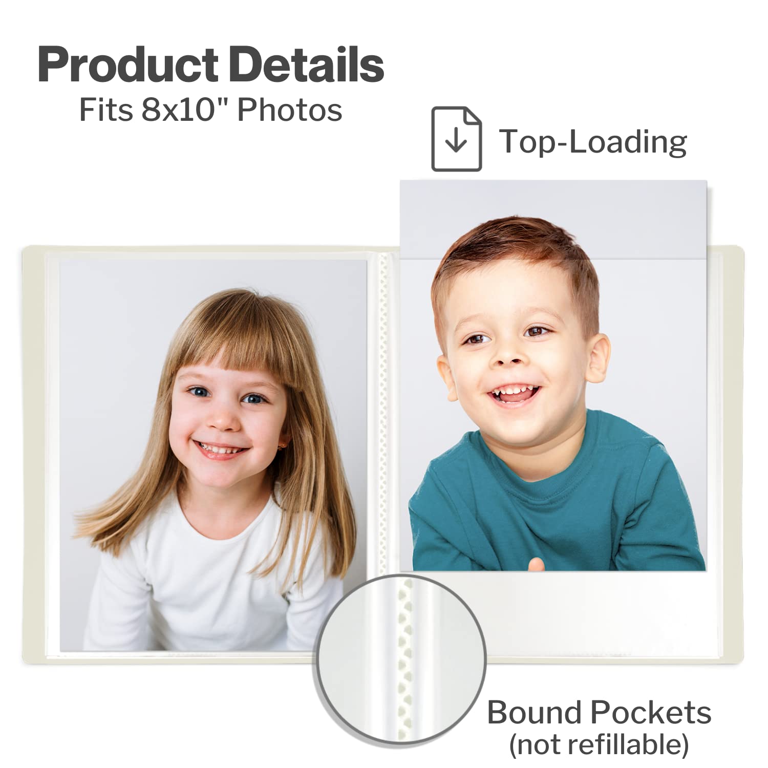 Size: 8x10 Photo Book outside covers measure 8.75(W) x 10.5(H). Front cover has inner pocket for loose paper. Pockets are 8x10". Portfolio book lies flat when open.