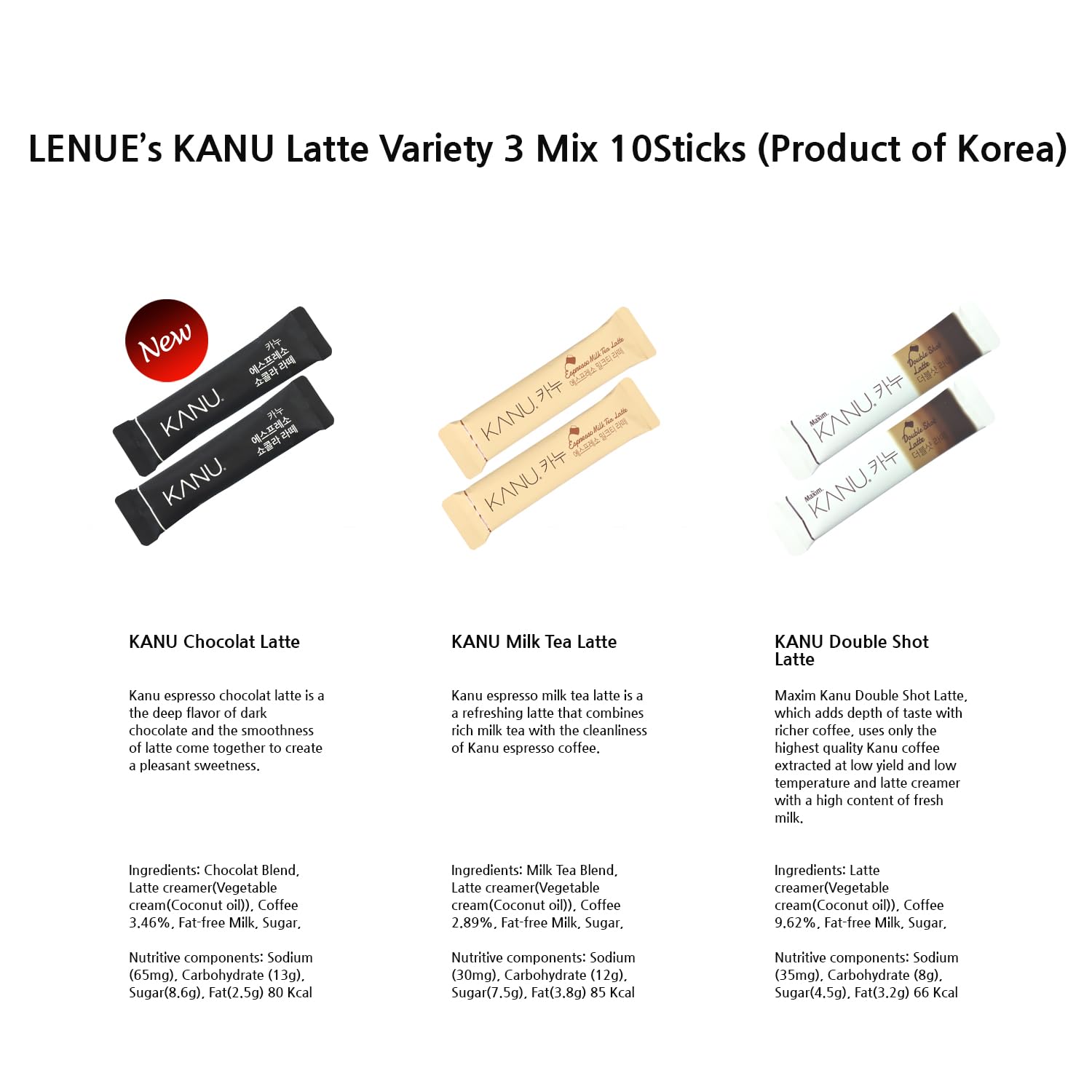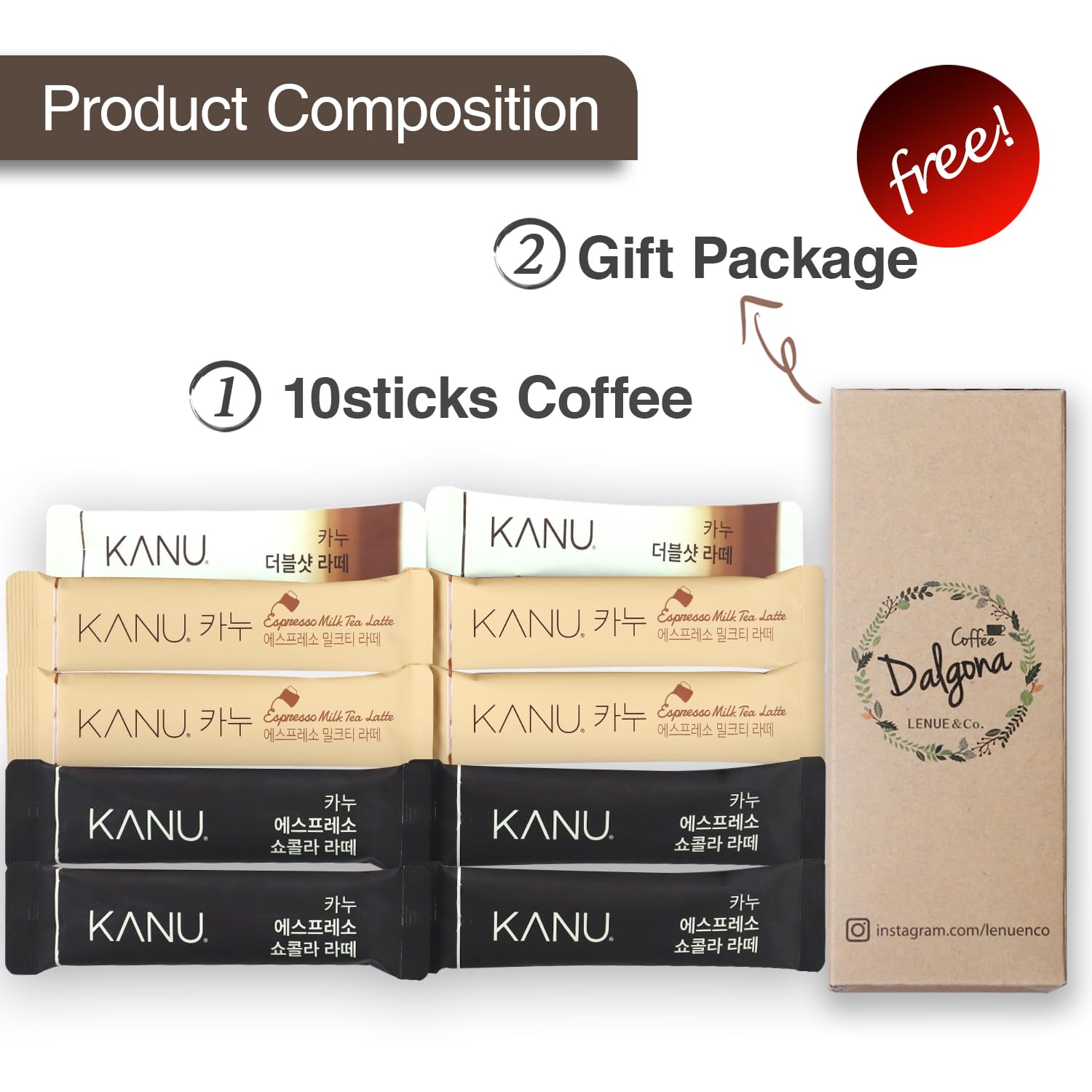 🎁 LENUE’s Maxim KANU Latte Coffee Mix Gift set : Total 10 Sticks Best Korean Coffee Latte Mix Sample packets : (4) x KANU Espresso Chocolat Latte, (4) x KANU Espresso Milk Tea Latte, (2) x KANU Double Shot Latte, Craft gift box; Product of Korea, Expiration: yyyy/mm/dd or yy/mm/dd