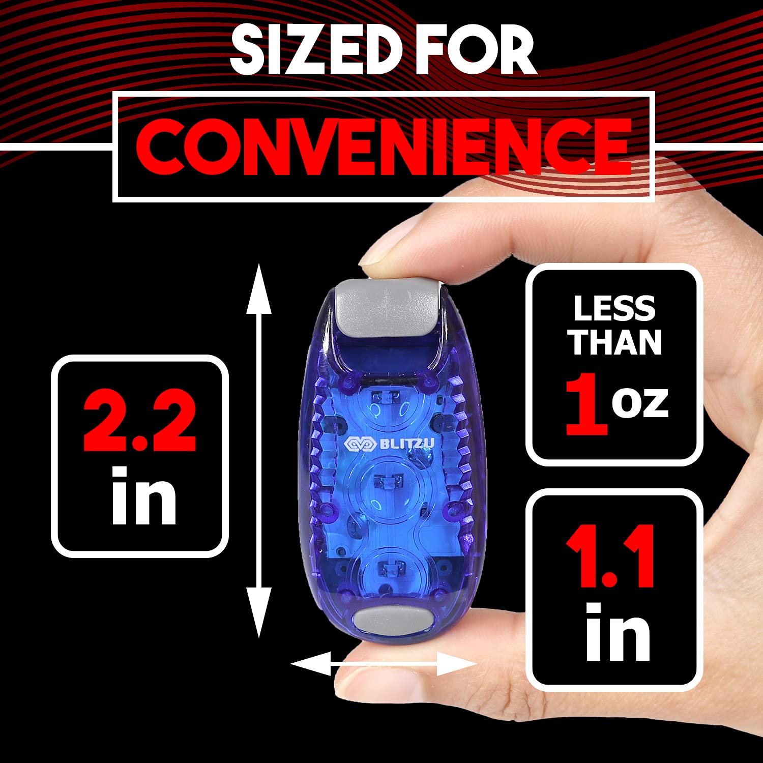 Lightweight + Weather Resistant . Each light weighs just 1/3 oz, about the size of a USB stick. Perfect for use in rain or snow, daytime or nighttime, and summer or winter. Count on them to keep you visible and safe during any outdoor activity in any weather.