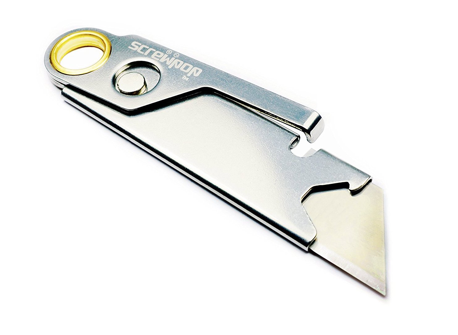 FEATURES -- 4 step utility blade (fits 2 notch standard utility blades from all brands), stainless steel body, yellow brass eyelet. Includes integrated BOTTLE OPENER!