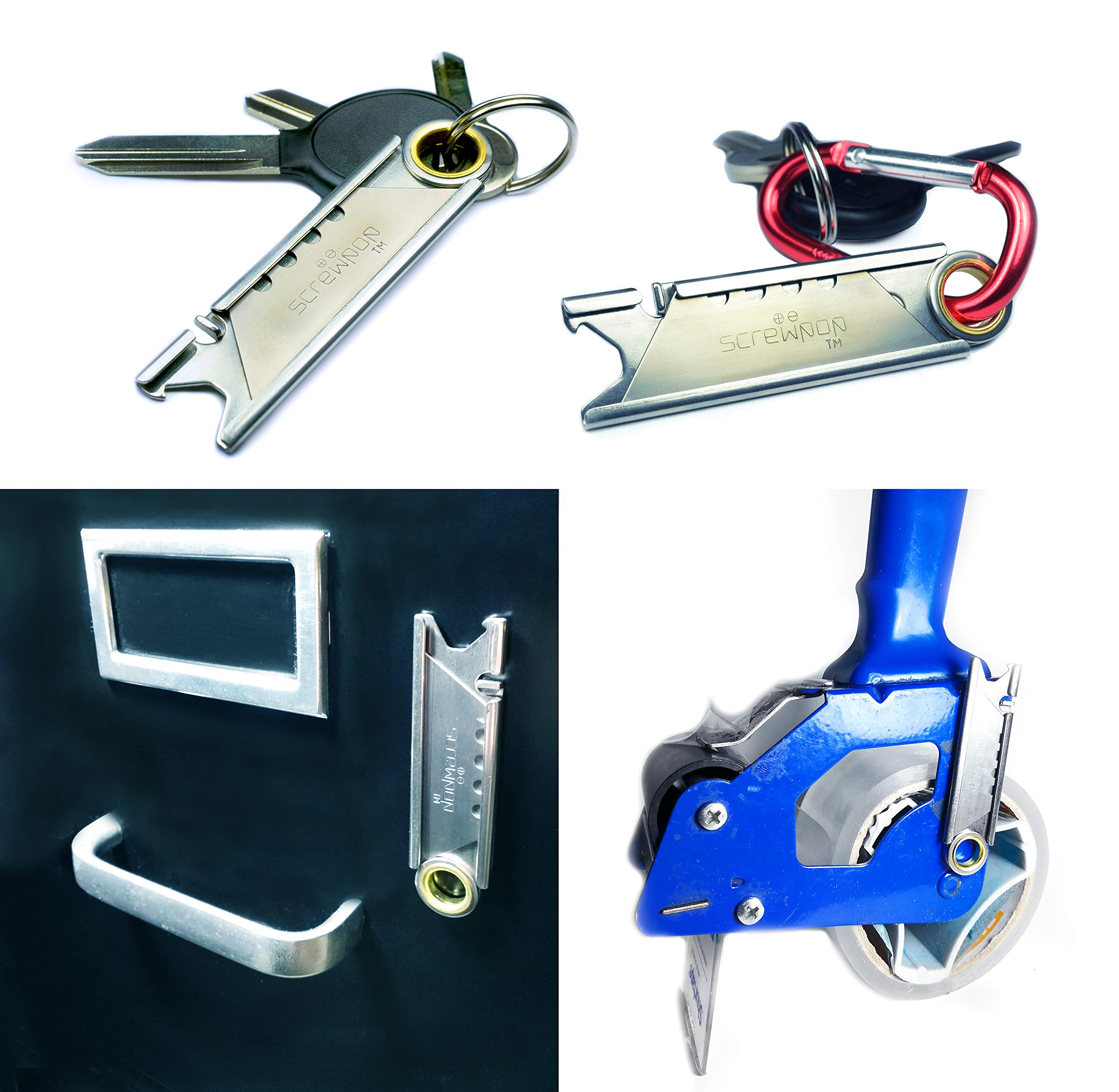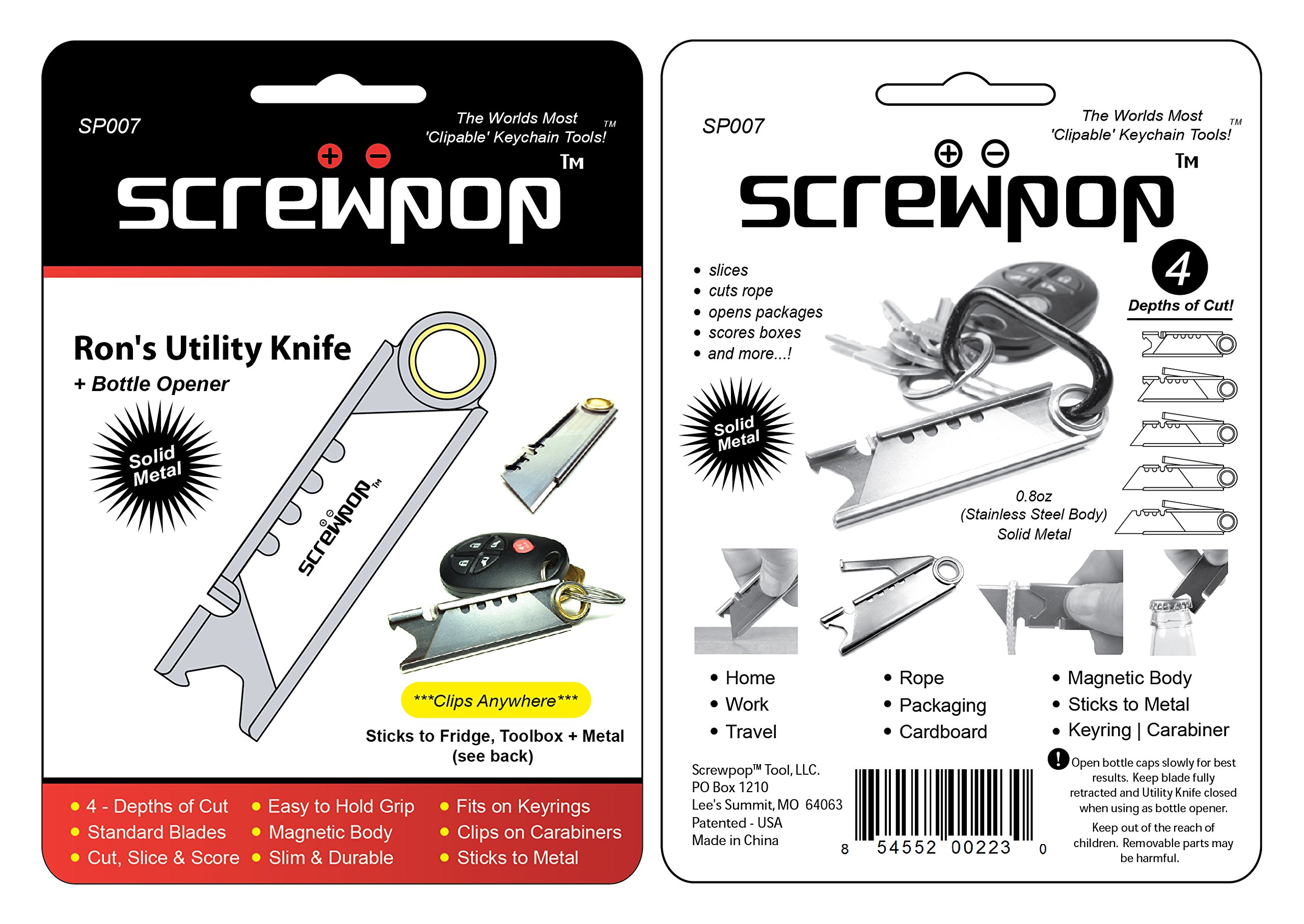 Screwpop Tool LLC. prides itself by offering only they best in everyday carry items. Our products exceed consumer expectations with highly functional designs that are compact, durable and practical. We are known as, “The World’s most Clipable Keychain Tools”. And unlike many other products on the market, Screwpop products fit nicely in a pocket, backpack, glovebox and more. Our designs easily clip to or attach onto a keyring, carabiner clip, paracord, belt loop and lanyard. Rons Utility Knife 3.0 (Model SP007) Measures Size 3/16" x 13/16" x 3 1/8 and weights approximately 0.8oz. All metal construction for a lifetime of use. Other handy features include: - includes 4 step utility blade - ultra strong neodymium magnetic catch - large eyelet for attachment - bottle opener
