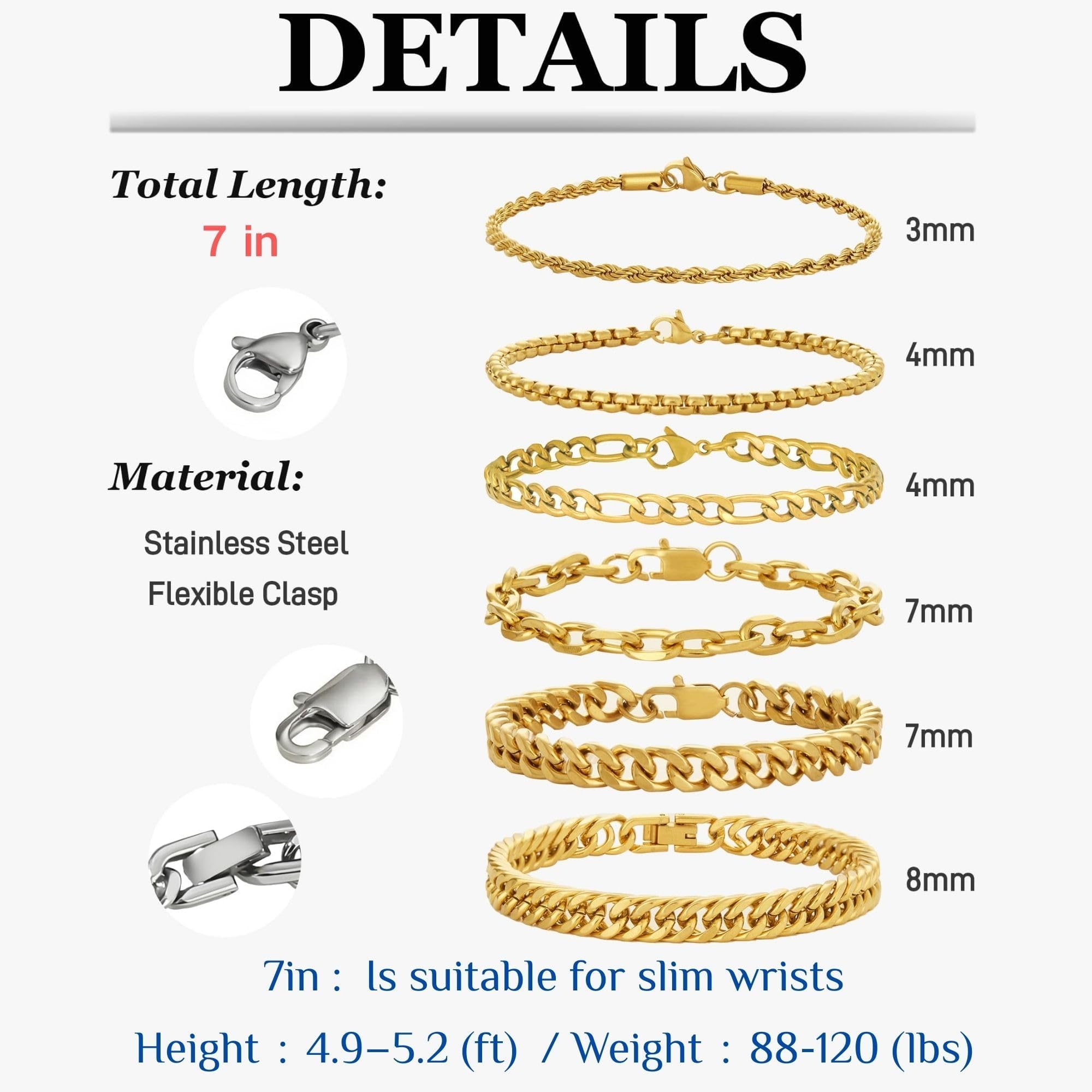Stainless Steel Bracelets: The Cuban bracelet consists of 6 different stainless steel bracelets, each of which is a classic style that can be matched with most clothing. The rich styles provide you with plenty of matching options. You can choose to wear a few of the bracelets, or wear all of them at once. You can wear one part yourself and give the other part of the bracelets to your partner as a surprise, as a romantic expression