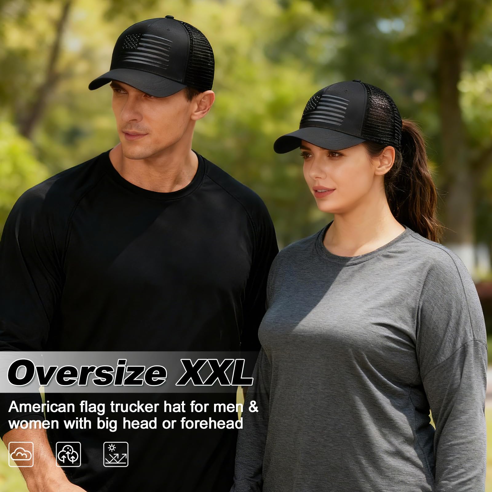 Description Oversized XXL American Flag Baseball Cap – Style, Comfort, and Patriotism Combined Show your American pride with this oversized XXL US flag baseball cap, designed for men and women with big heads or thick hair. Featuring a bold American flag print, this hat is perfect for outdoor enthusiasts, sports fans, or anyone looking to make a patriotic statement. Why Choose This Trucker Hat? Perfect Fit: Adjustable snapback closure ensures a comfortable fit for head sizes 23.6"-25.6". Breathable Design: Mesh back and side panels provide maximum airflow, keeping you cool and dry during outdoor activities like hiking, camping, or fishing. Durable & Fade-Resistant: Made with high-quality cotton twill front panels and rugged polyester mesh, this hat is built to last. UPF 50+ Sun Protection: Offers excellent UV protection, making it ideal for sunny days at the beach, park, or backyard BBQ. 8 Stylish Colors: Available in Black Gray, Light Gray, Green, Black, Blue, Camo, Wine red, and Dark Gray to match any outfit or occasion. Great for Gifting Looking for a unique gift? This American flag baseball cap is a thoughtful present for friends, family, or colleagues. Whether it’s for a birthday, Father’s Day, or a patriotic holiday, this hat is sure to impress. Package Includes:1 x Oversized XXL American Flag Trucker Hat Wear Your Pride, Stay Comfortable, and Stand Out with This Stylish and Functional Baseball Cap!