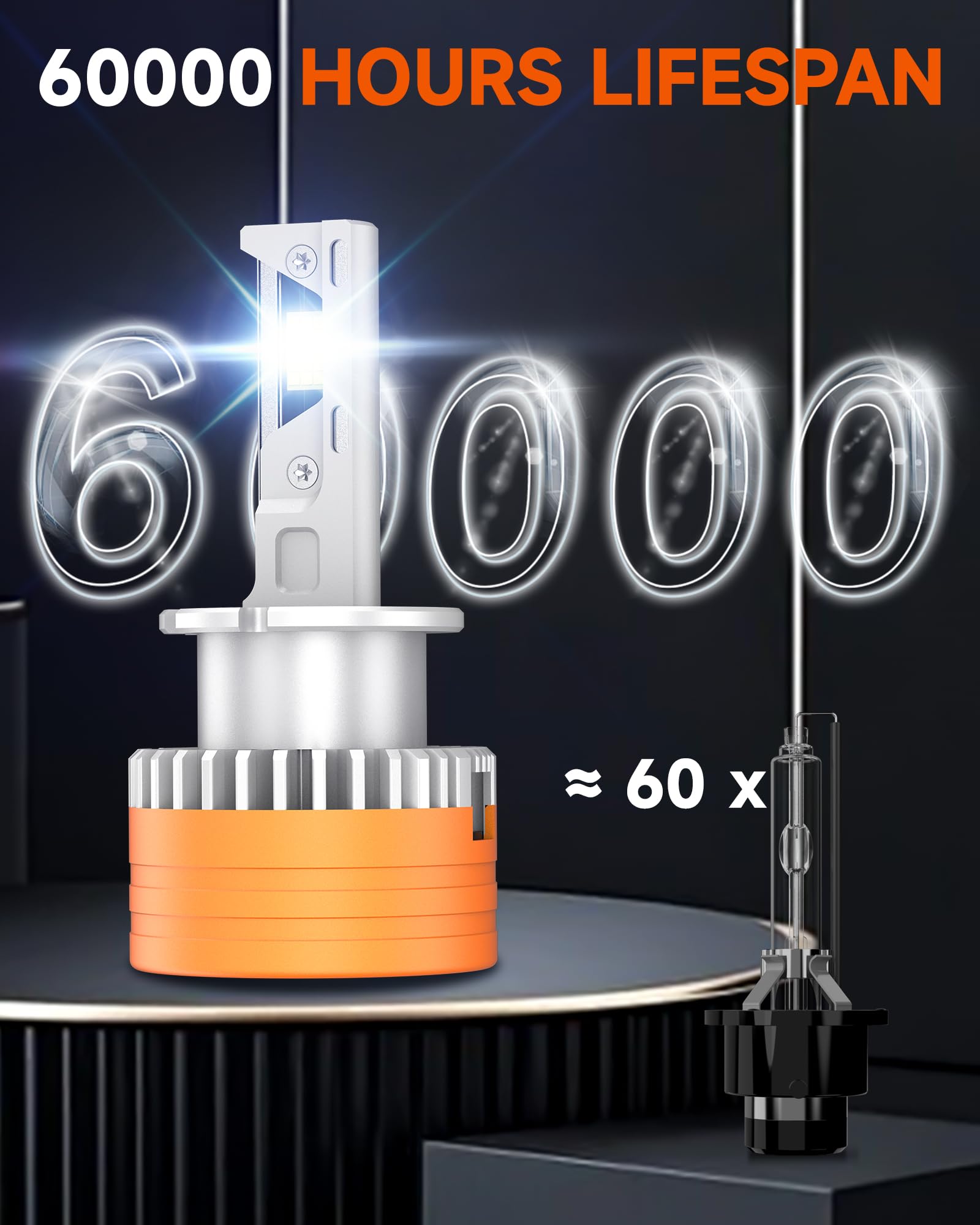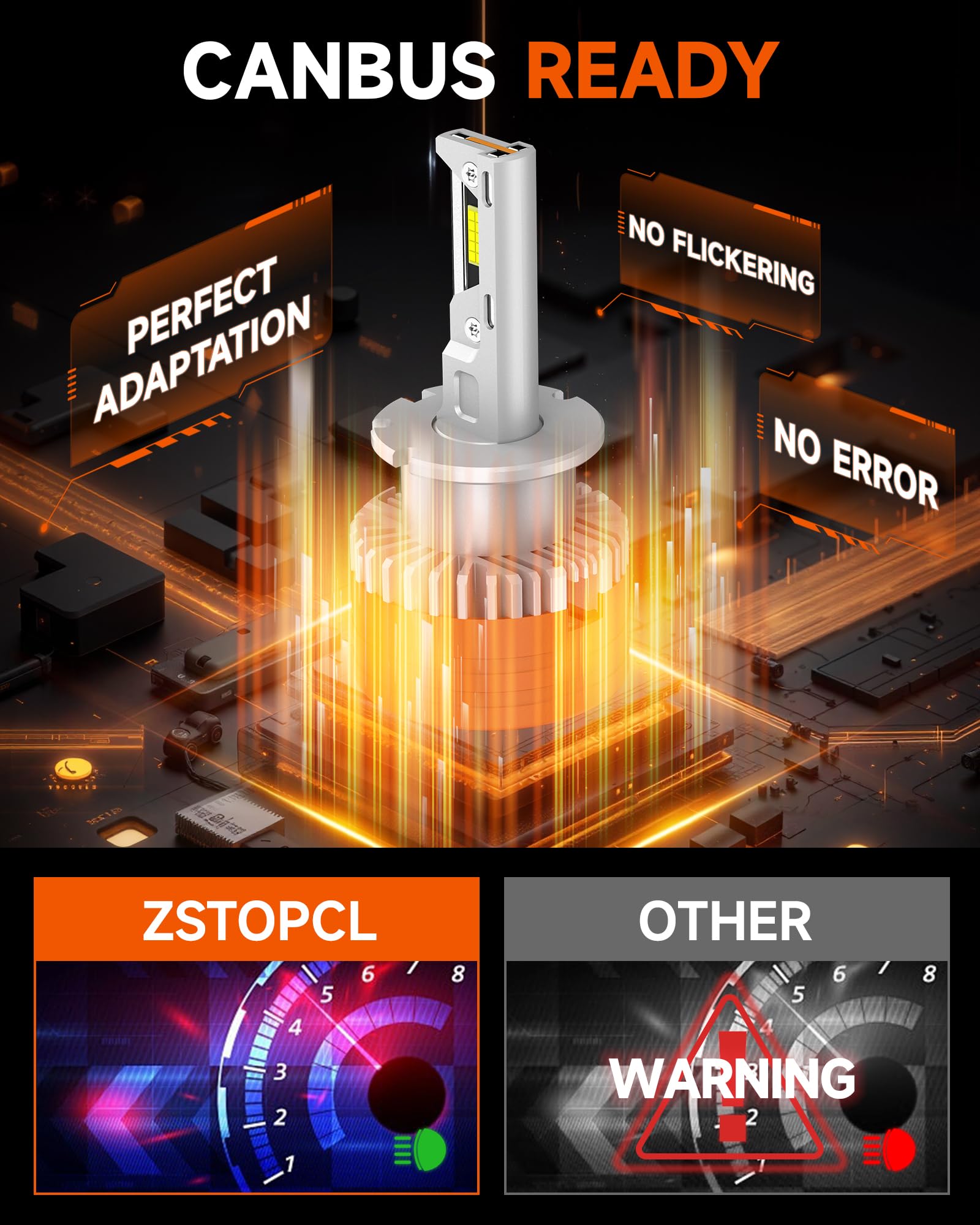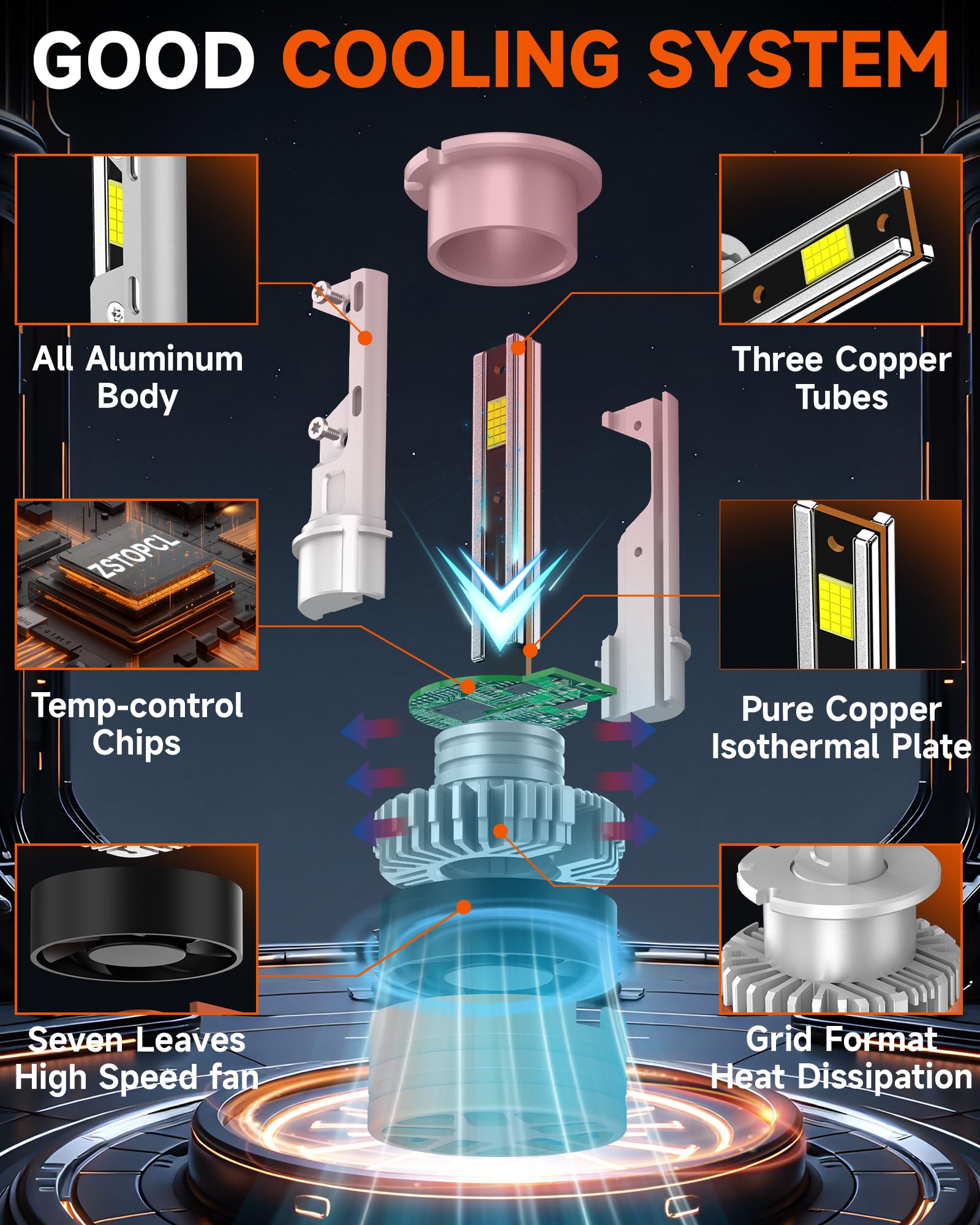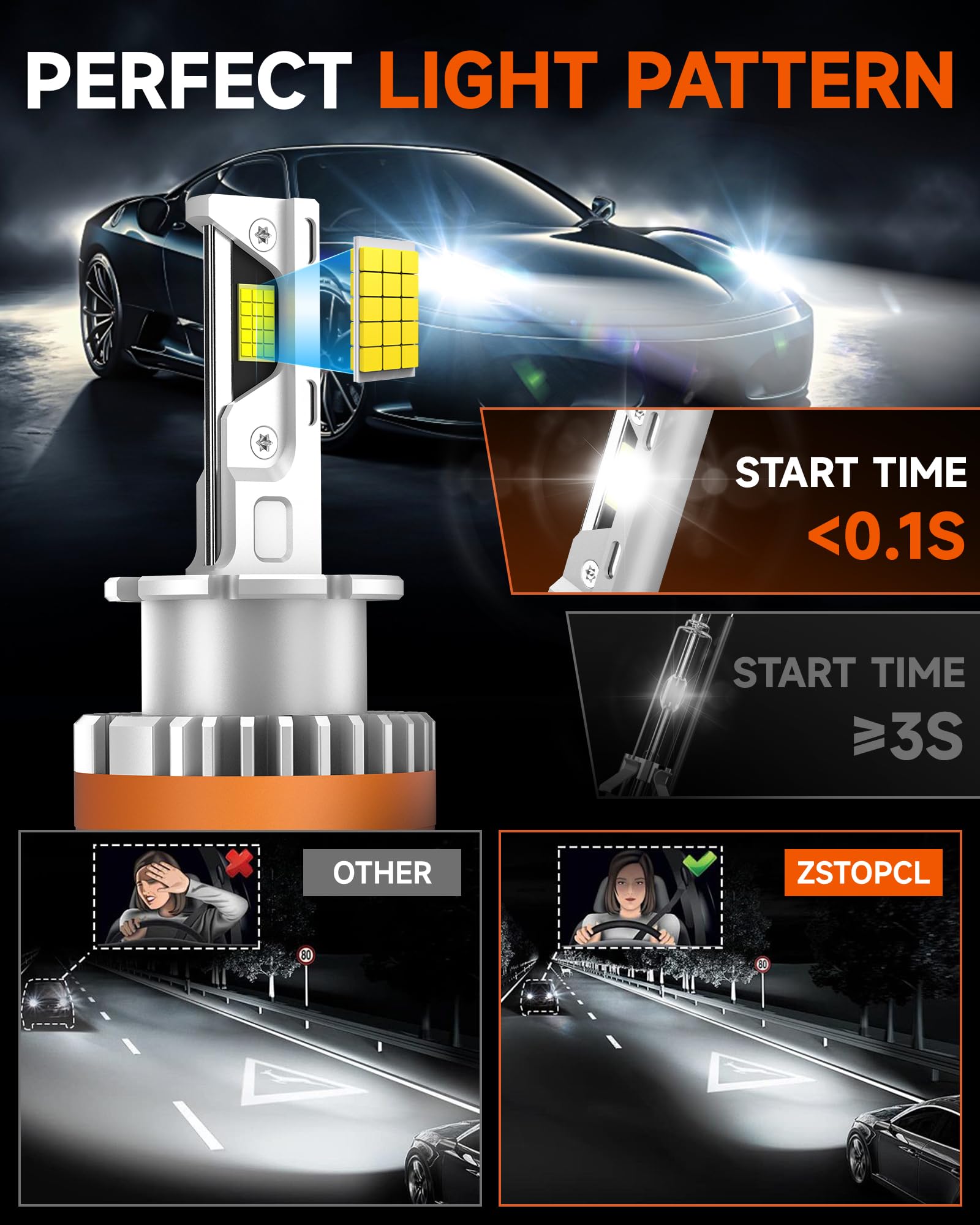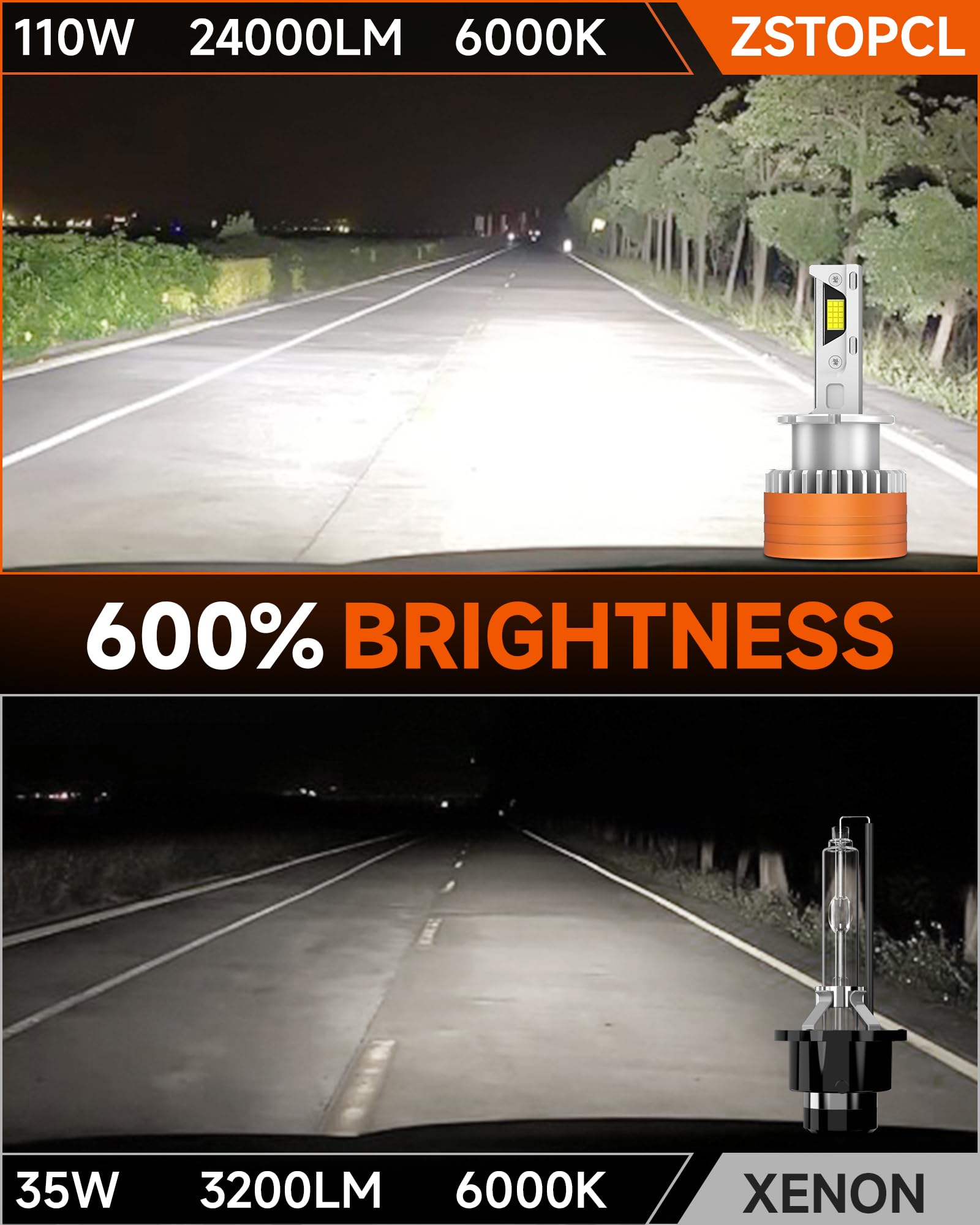 【Upgraded 600% Brightness】ZSTOPCL d2s bulb adopts a double-sided 30 CSP chips design, which can reach 24000LM and has a brightness of 600% of original HID bulbs. The light pattern is perfect, without black spots or dark areas, and will not affect the driver of the oncoming vehicle