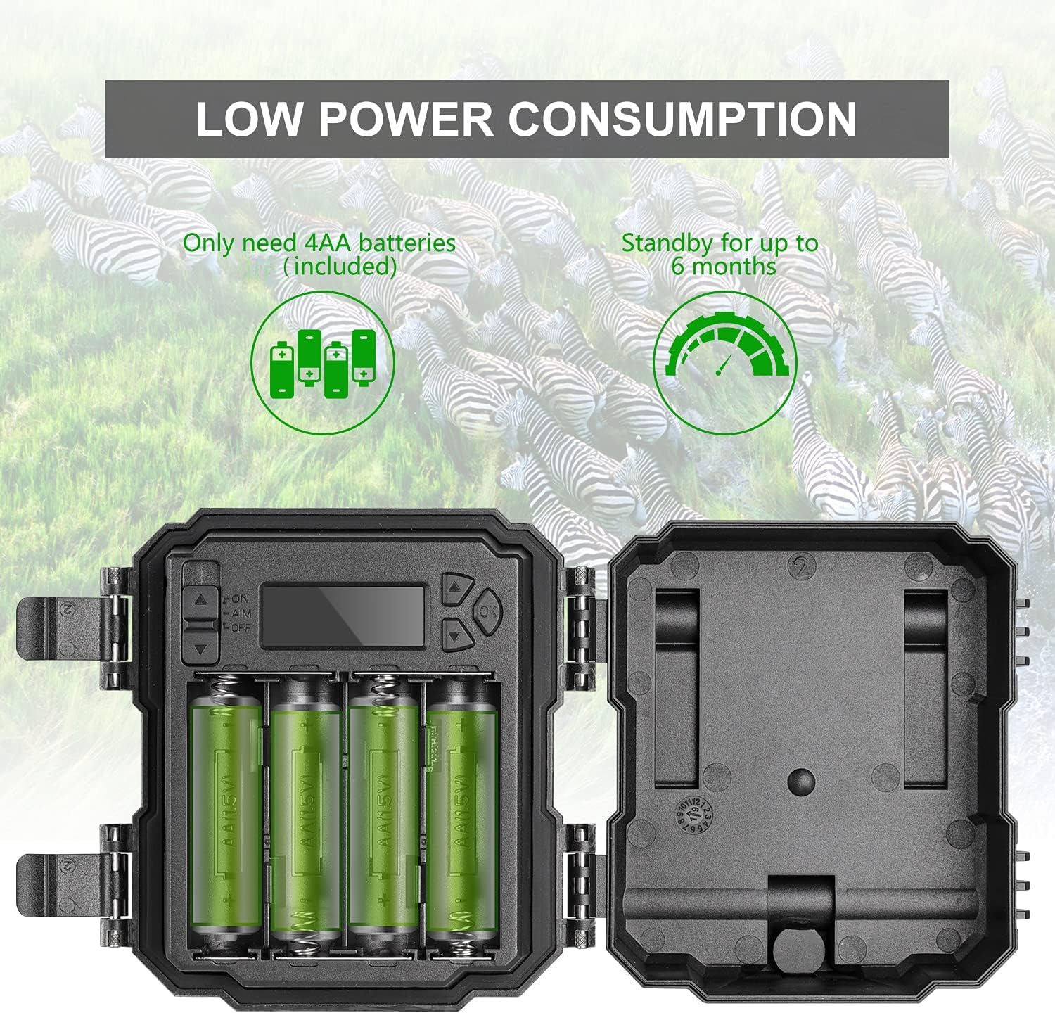 Low power consumption: This new hunting trail cam just need four pieces of batteries, which reduce its weight for you to go outdoor with holding it. And it can extend its use of time for its extremely low power consumption in standby operation.(Including two SD cards and 8AA batteries)