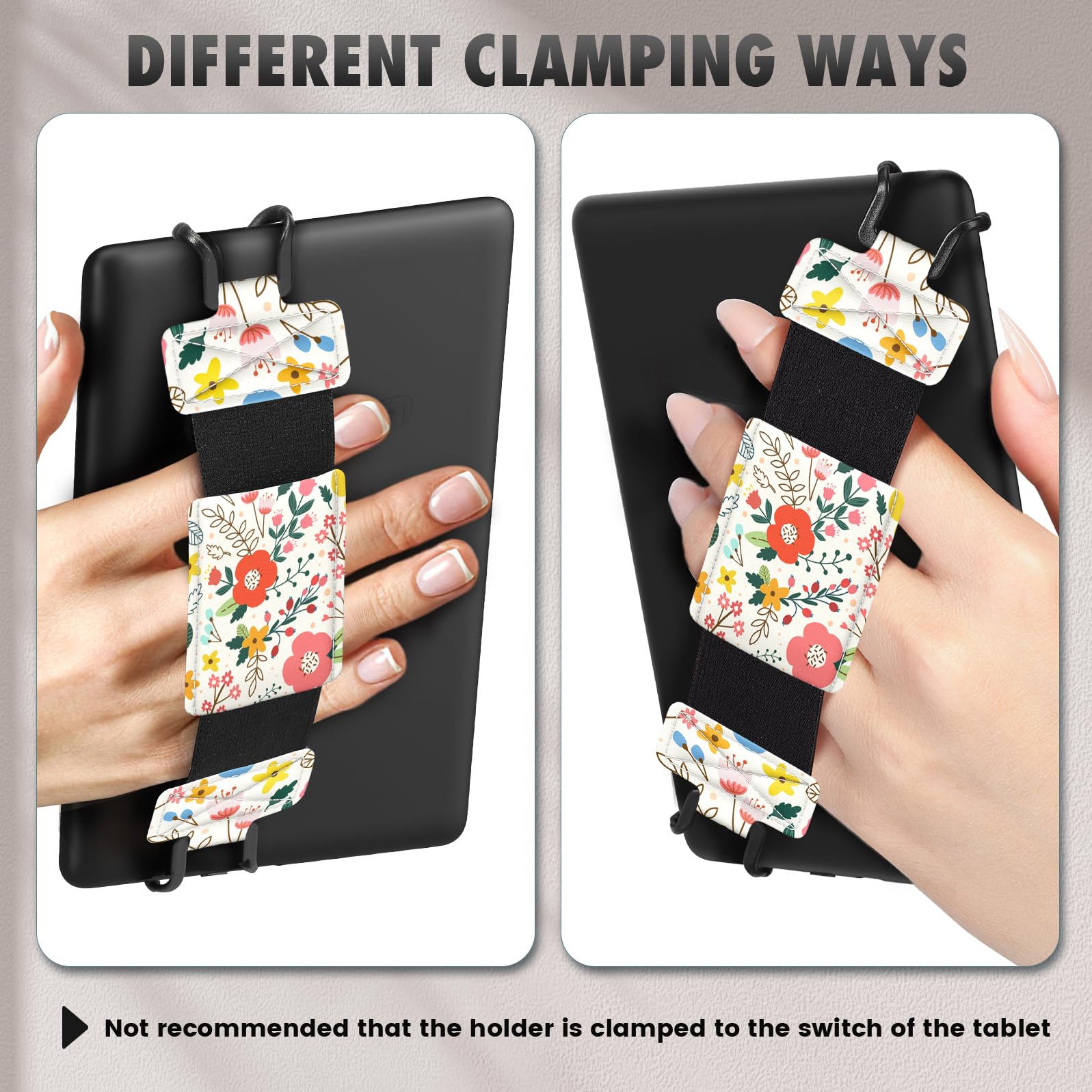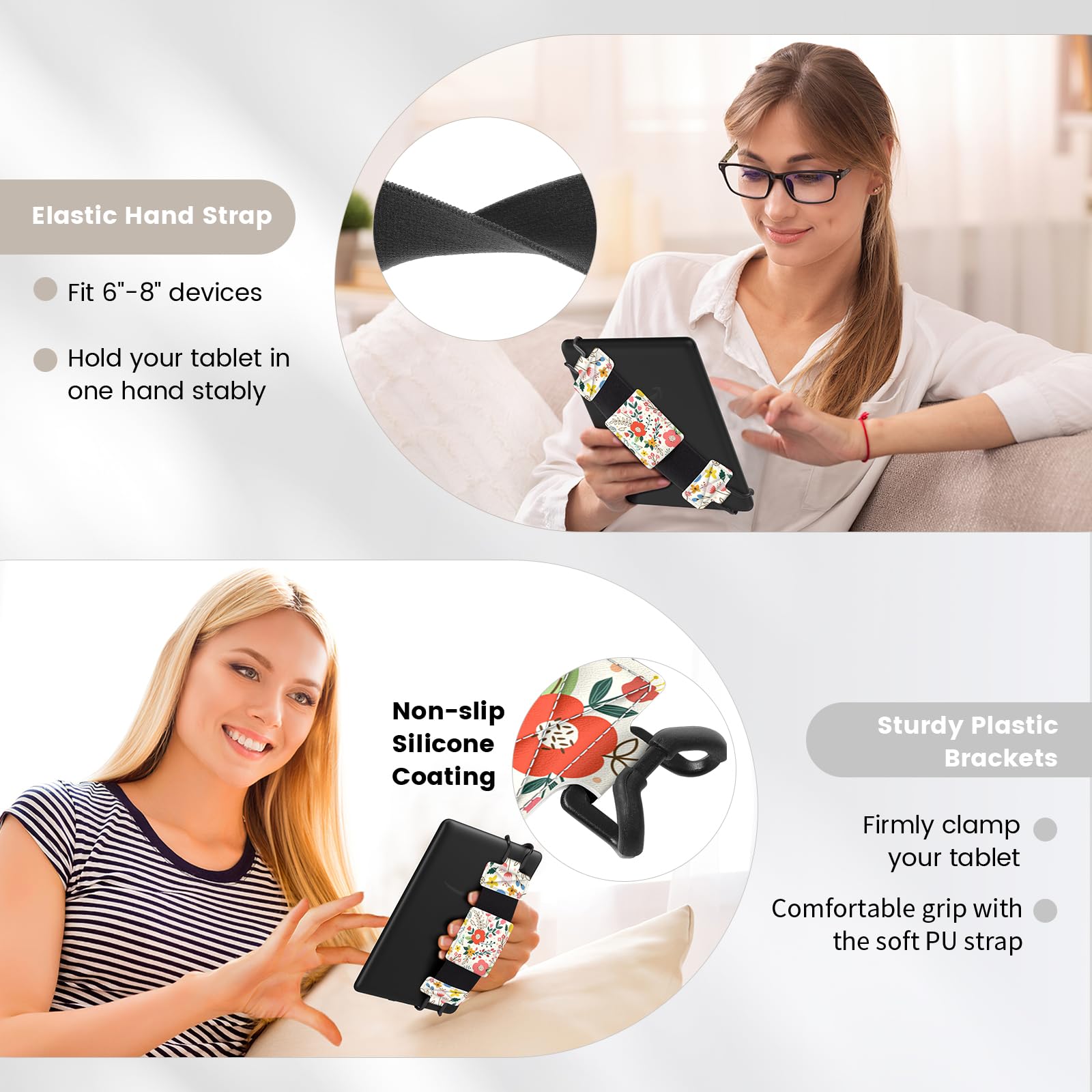 Compatibility: Universal hand strap holder with high durability and elasticity to fit 6 - 8" E-Reader and tablet, including Fire Tablet/Kindle/Kobo Nia/Kobo Clara HD/Lenovo tab M7/tab M8/Voyaga/Sony/Tolino tablet, etc. (Note: Please measure your e-book readers or tablets before purchase.)
