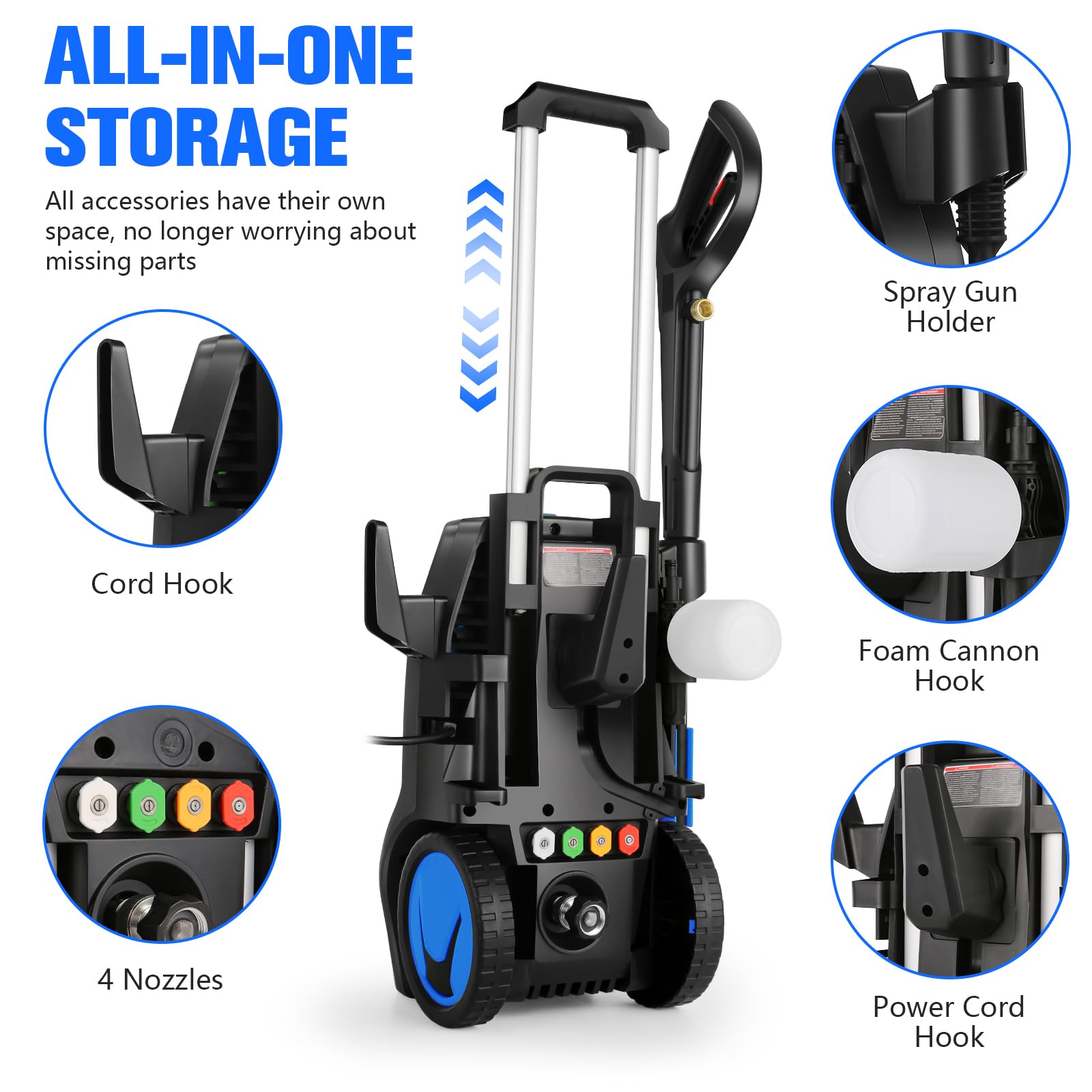 【Convenient Storage】The deck Pressure Cleaner is equipped with a power cord hook and nozzle holder for easy access. In addition, its compact design makes it easy to store in a garage or pantry when not in use.